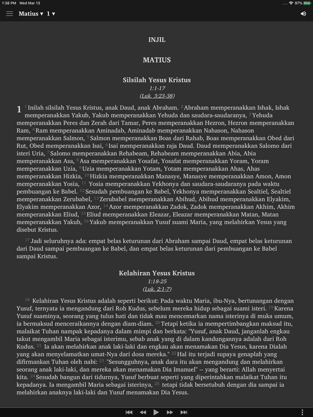 Aplikasi Alkitab Karaoke memungkinkan Anda untuk membaca sekaligus mendengarkan Alkitab. Saat ini, versi Alkitab yang didukung oleh Alkitab Karaoke adalah versi Terjemahan Baru. Alkitab Karaoke mengandung teks dan audio seluruh Alkitab (Perjanjian Lama dan Perjanjian Baru). Selain teks dan audio Alkitab, fitur utama dari Alkitab Karaoke adalah fungsi highlighting yang berguna untuk menyoroti ayat yang sedang dibacakan.