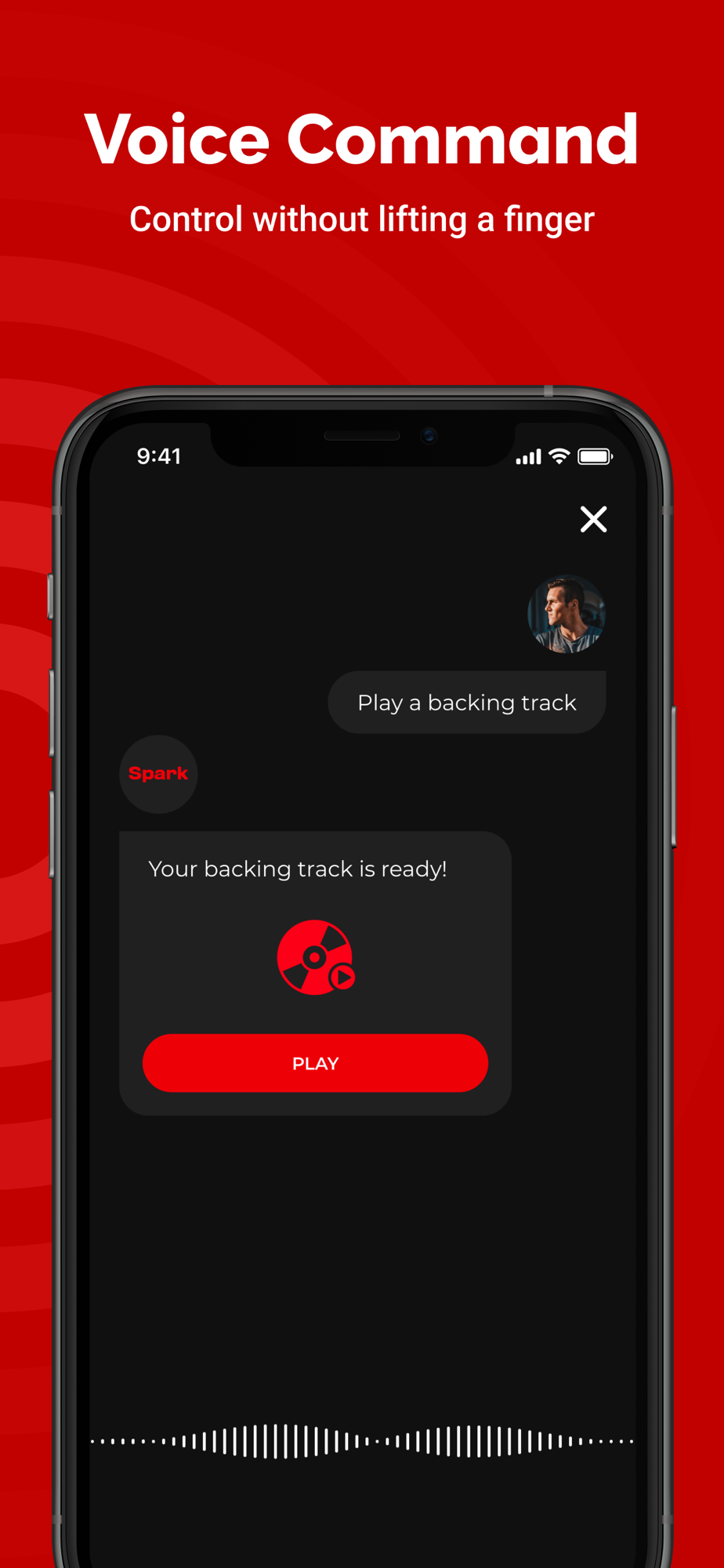 The Spark app responds to your voice commands. Tell it to stream a rock song or a blues backing track, or ask for a virtual band to follow your playing.