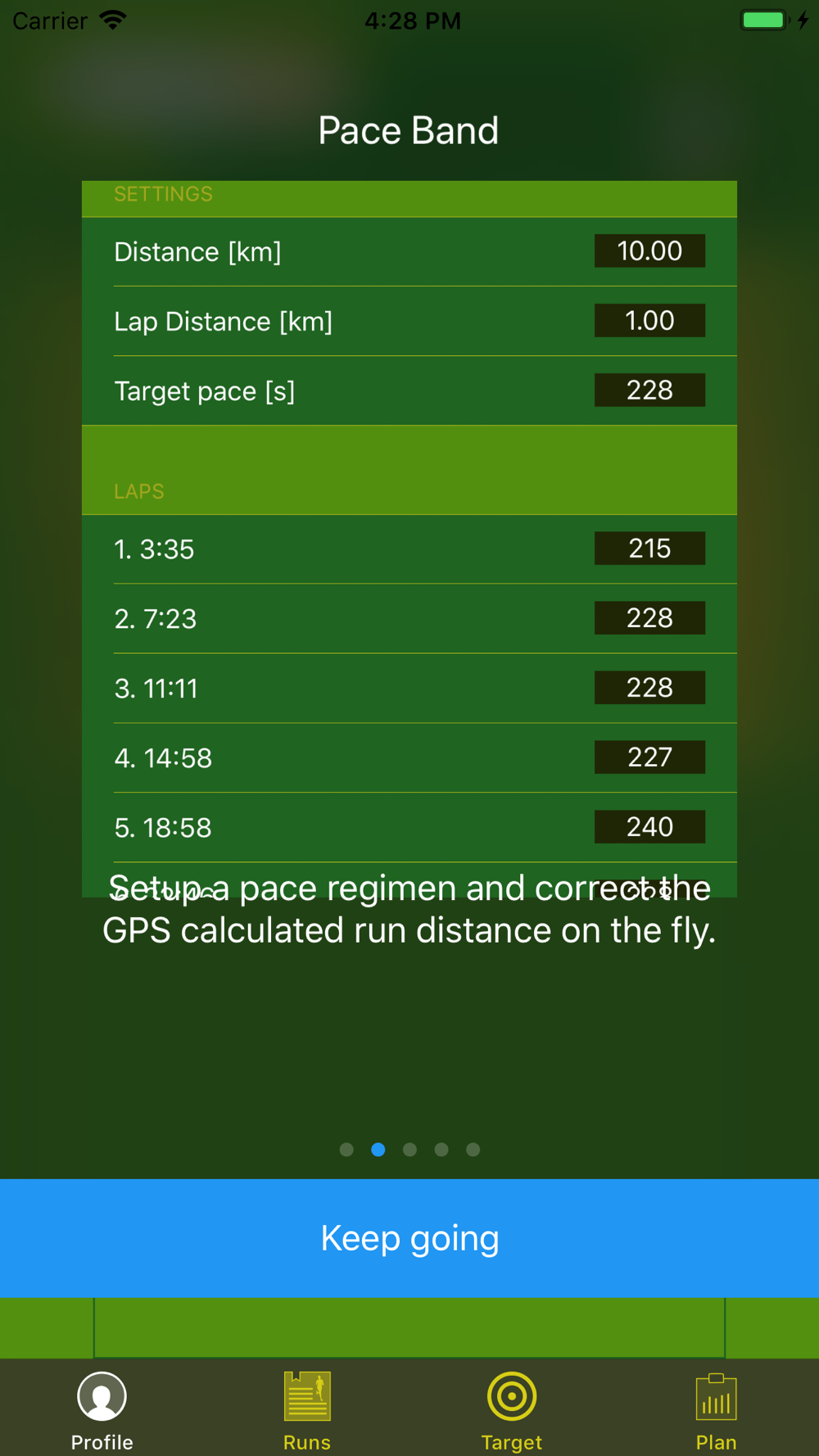 Setup a target race pace on your iPhone. Adjust each lap time or keep even pacing. Transfer the pace info to your watch and the app will notify you or your target pace and whether you are ahead or behind.