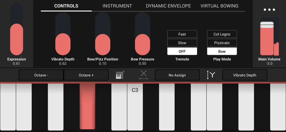 Control the instrument’s expressivity in real-time directly through the touch control interface on your iPhone or iPad including the exclusive virtual bowing touch surface!