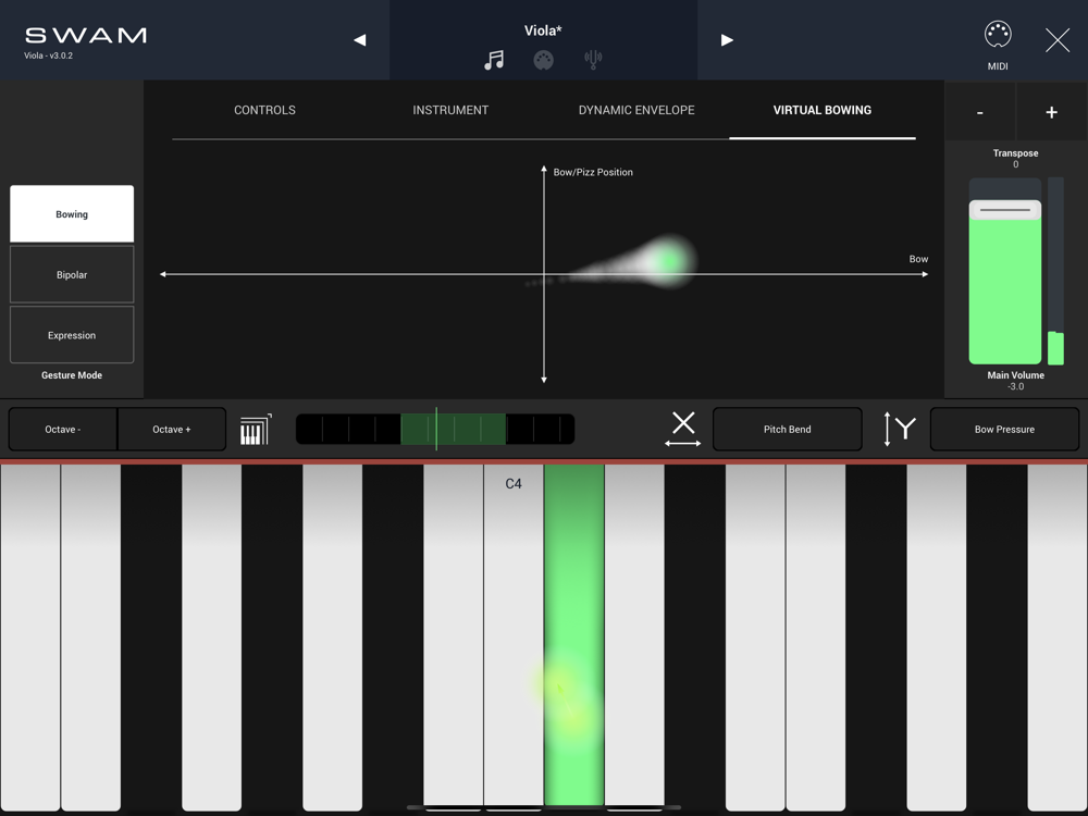 SWAM Viola for iOS can be used as a standalone instrument for playing in real-time, or as a plug-in for mobile music production. Play with your favorite external controller or directly from your iOS device through our intuitive interface, friendly for blind and visually impaired users.