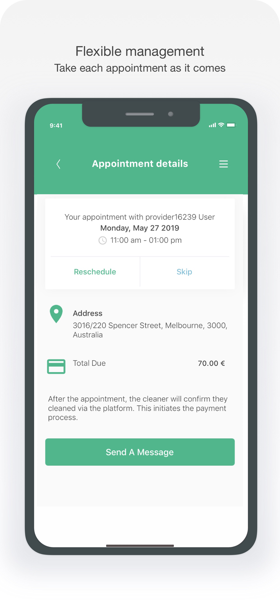 + Profiles of cleaners: When making a new booking, you'lll see profiles of the available cleaners, including ratings and reviews from current and previous customers.