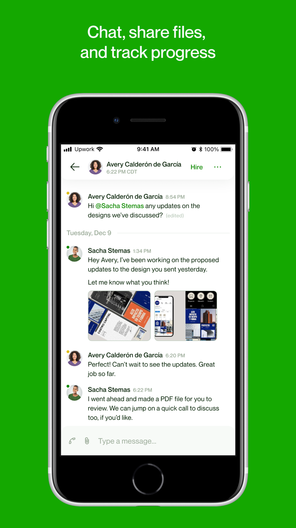 Use Upwork to chat or video call, share files, and track project milestones from your desktop or mobile device.