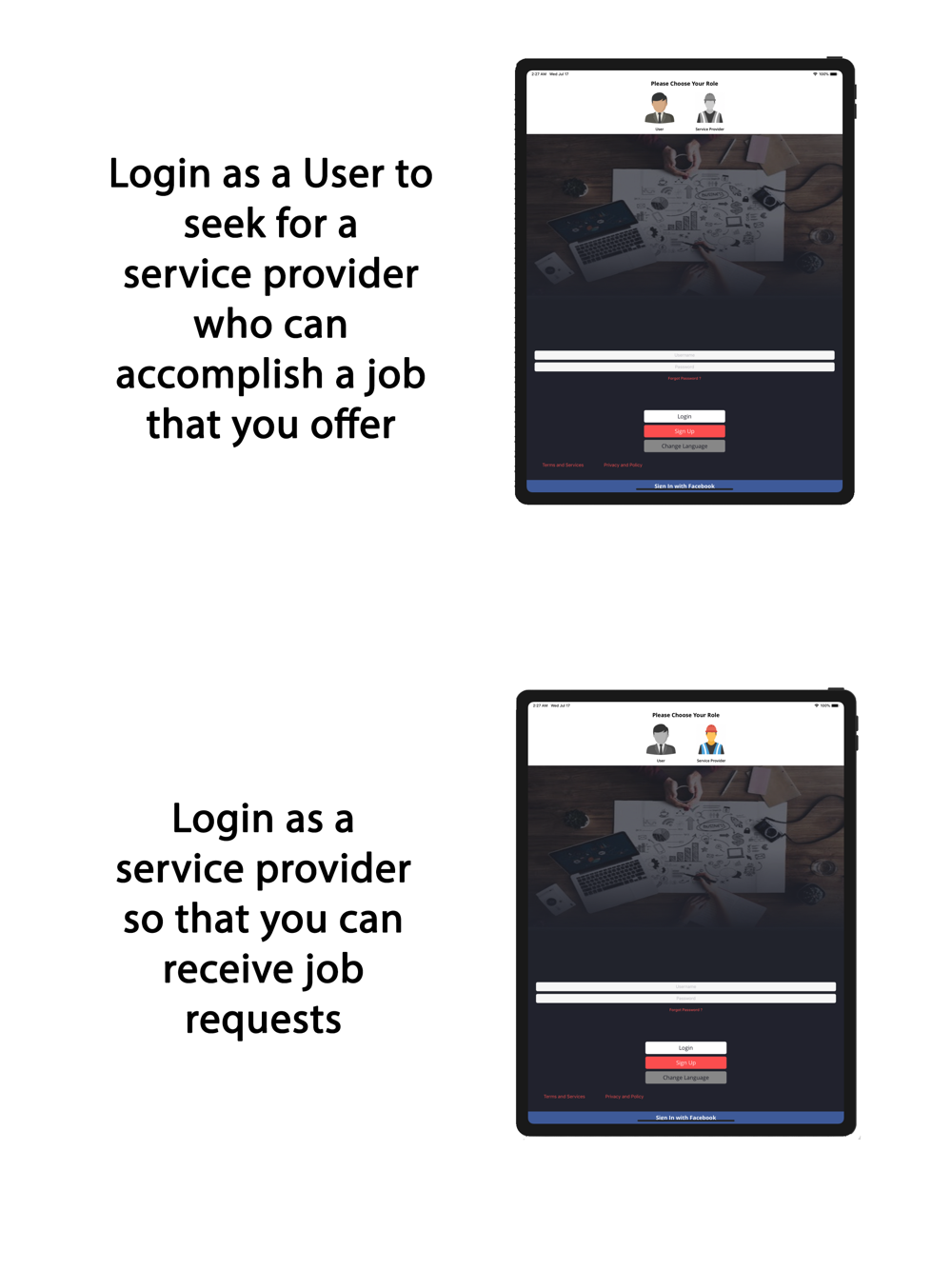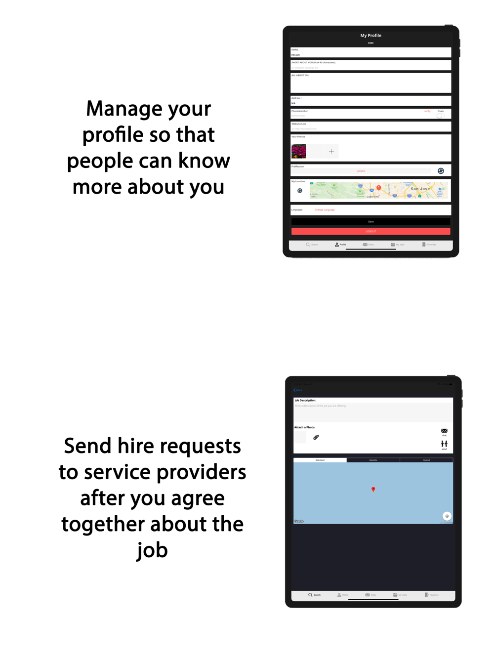 - simply signup as a user then search for service providers by choosing the category, after all the service providers will be locates on the map and you can contact them through the built in app messaging and making a deal about the job you are offering.