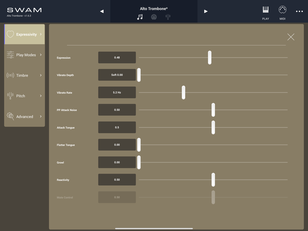 IMPORTANT: If you choose to play using an external controller, please note that a controller with the ability to continuously control the expression (like an expression pedal, breath controller, MPE device, wind controller, …) is REQUIRED. The same way real players need a bow to express themself on their instrument, SWAM Alto Trombone needs something to control its expressivity. SWAM instruments do not work with just note-on velocity.