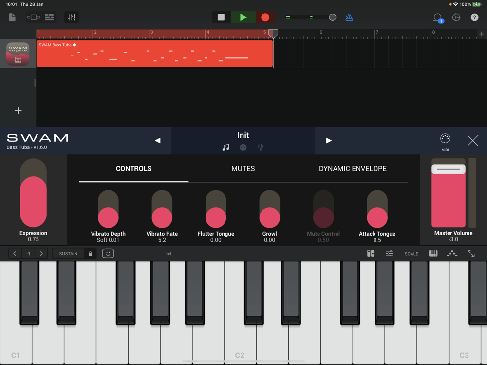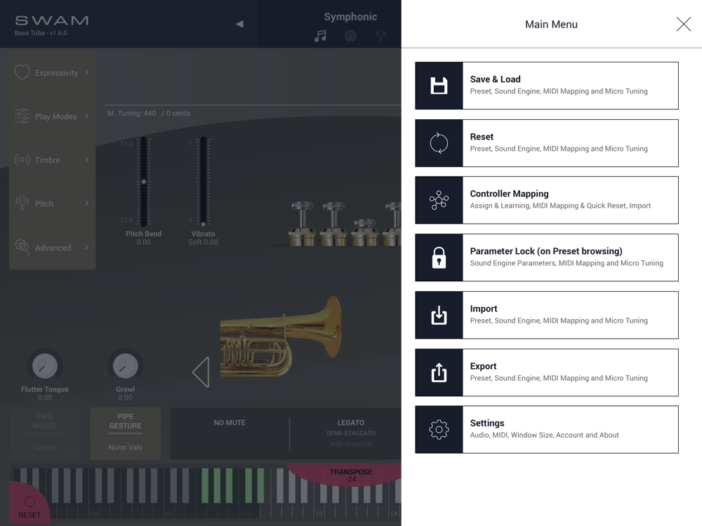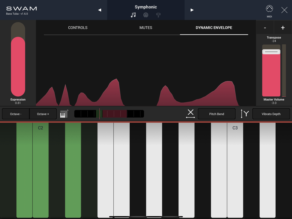 SWAM Bass Tuba for iPad can be used as a standalone instrument for playing in real-time, or as a plugin for mobile music production. Play with your favorite external controller or directly from the iPad through our intuitive interface.