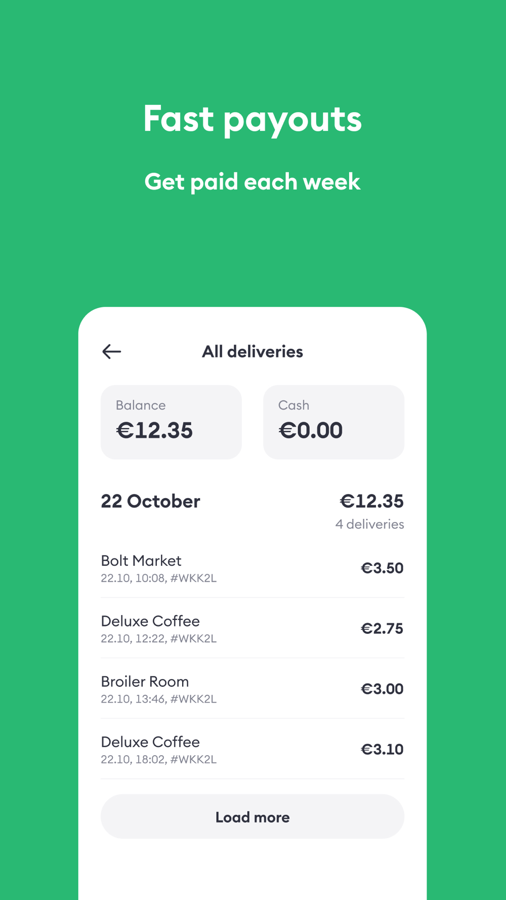 • Sign up to deliver inside the Bolt Courier app or at https://bolt.eu/food/courier;