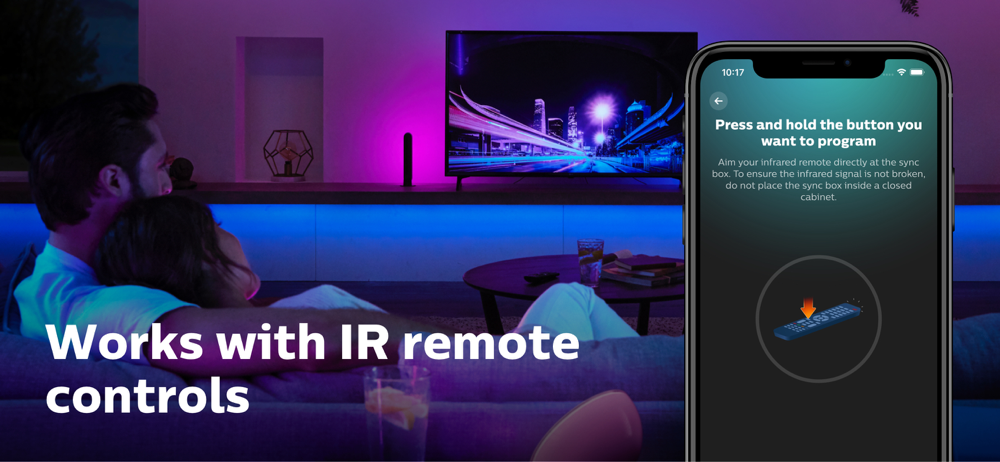 A simple setup allows you to easily connect to your Hue Bridge and use your sync box with any TV and HDMI device. Control your entertainment experience and sync box any way you want: with the app, on-product control button, any infrared TV remote, or your voice via Amazon Alexa, Siri, and the Google Assistant.