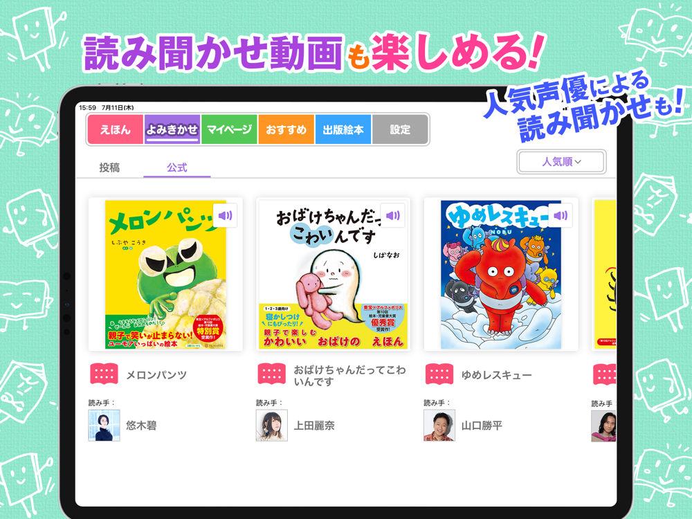 絵本ひろばに掲載されている絵本の「読み聞かせ動画」を見ることができます。人気声優による公式読み聞かせ動画も!