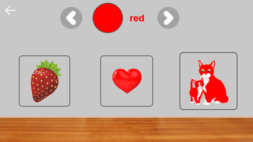 1) Learning colors: red, pink, gray, purple, blue, green, yellow and orange. So, your baby will learn 9 colors for kids in total. All the colors for babies are illustrated by three images with the objects of the same color.