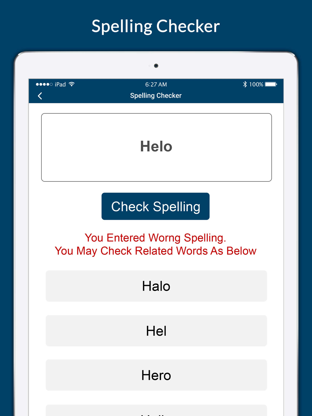 Learn the English language very well, to make spells correction which are faithful, easily understood for the user within a short time period. Create spells learning app that teaches the user how to spell English words. The learning process is accomplished like learning, practice, and checking. This type of stage covers in create spells. Spelling is consists of word sets beginning. The practice is provided to indicate whether the word is spelled correctly with advancement for the next word or not also to check grammer text in English. This app is suitable for Kid & adult who want to learn to spell in English.