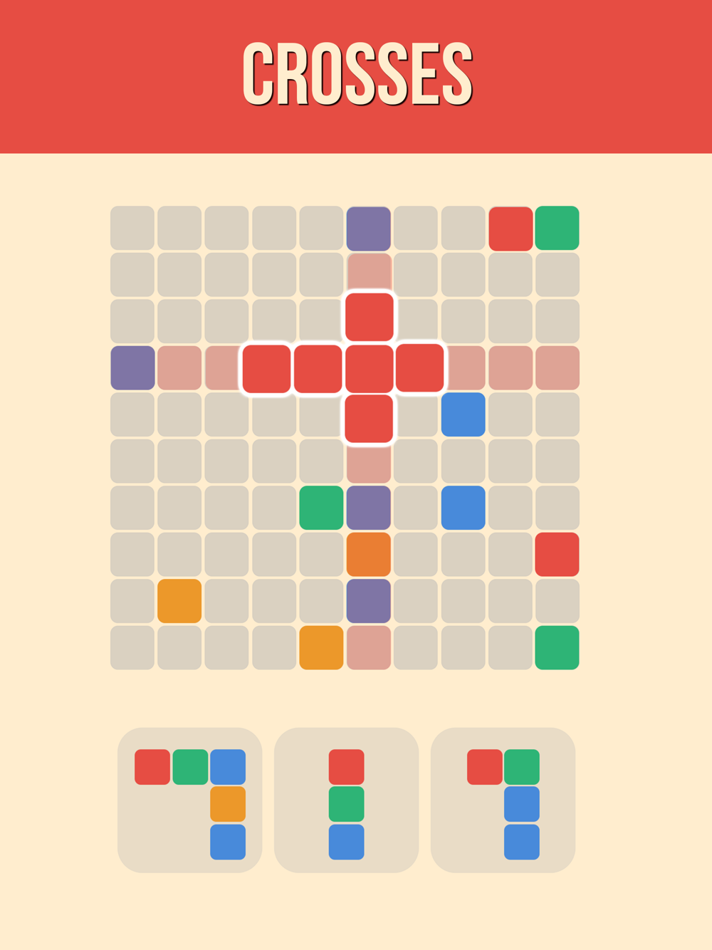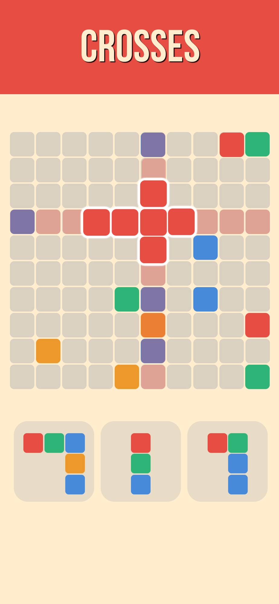 A relaxing game which requires thinking and strategy to succeed. Drag & Drop color pieces to the board so they group to disappear. 3 same colors in a row will be destroyed. 4 in a row will destroy the whole row. And finally you can form crosses to destroy both the row and column. How many tiles can you destroy?