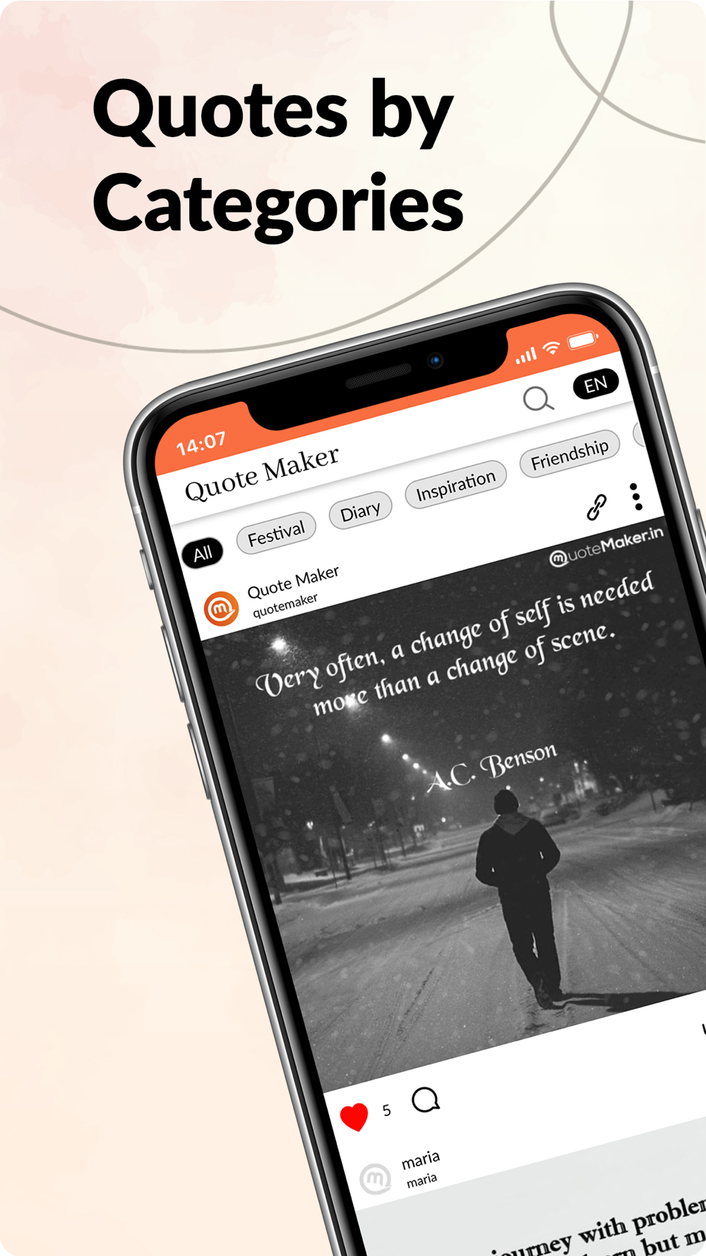 Create a stunning post on QuoteMaker. Here you can create a post with a beautiful design choose a background from the app or also choose from your gallery. Make your font more beautiful from the font settings and make your poem or quotes more beautiful. Save your post on one category and post to the public either private. There you can find many other posts that also motivate yourself to make amazing poems or quotes you can also motivate others by poetry. Best place to show your emotions and writing skills.