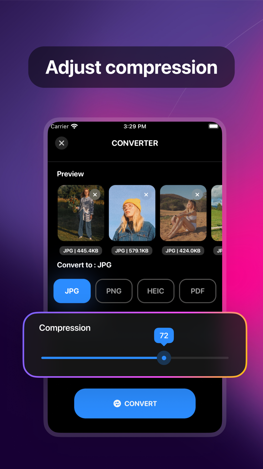 Easily convert your photos to JPG PNG HEIC PDF format in an instant!