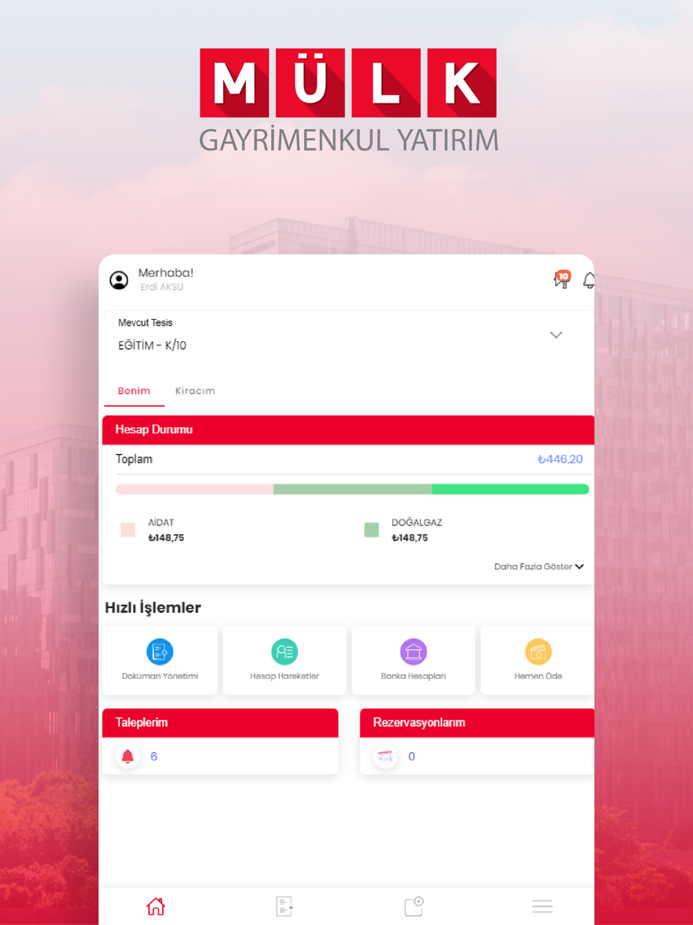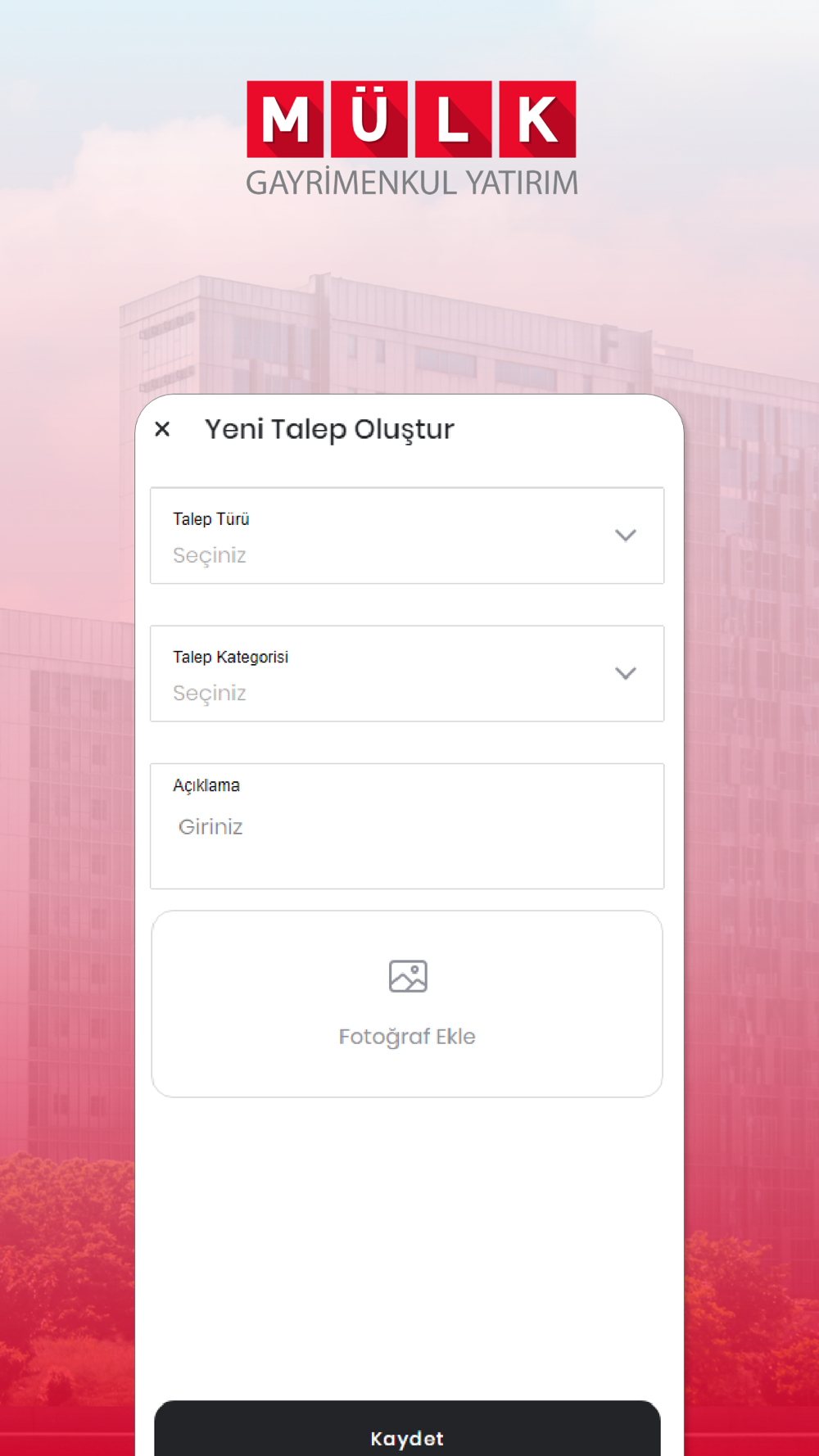 • Taleplerim; Teknik, Güvenlik, Temizlik, Bahçe Bakım vb. hizmetlerinde tespit edilen olumsuz durumların fotoğrafını çekerek iş talebi oluşturma,