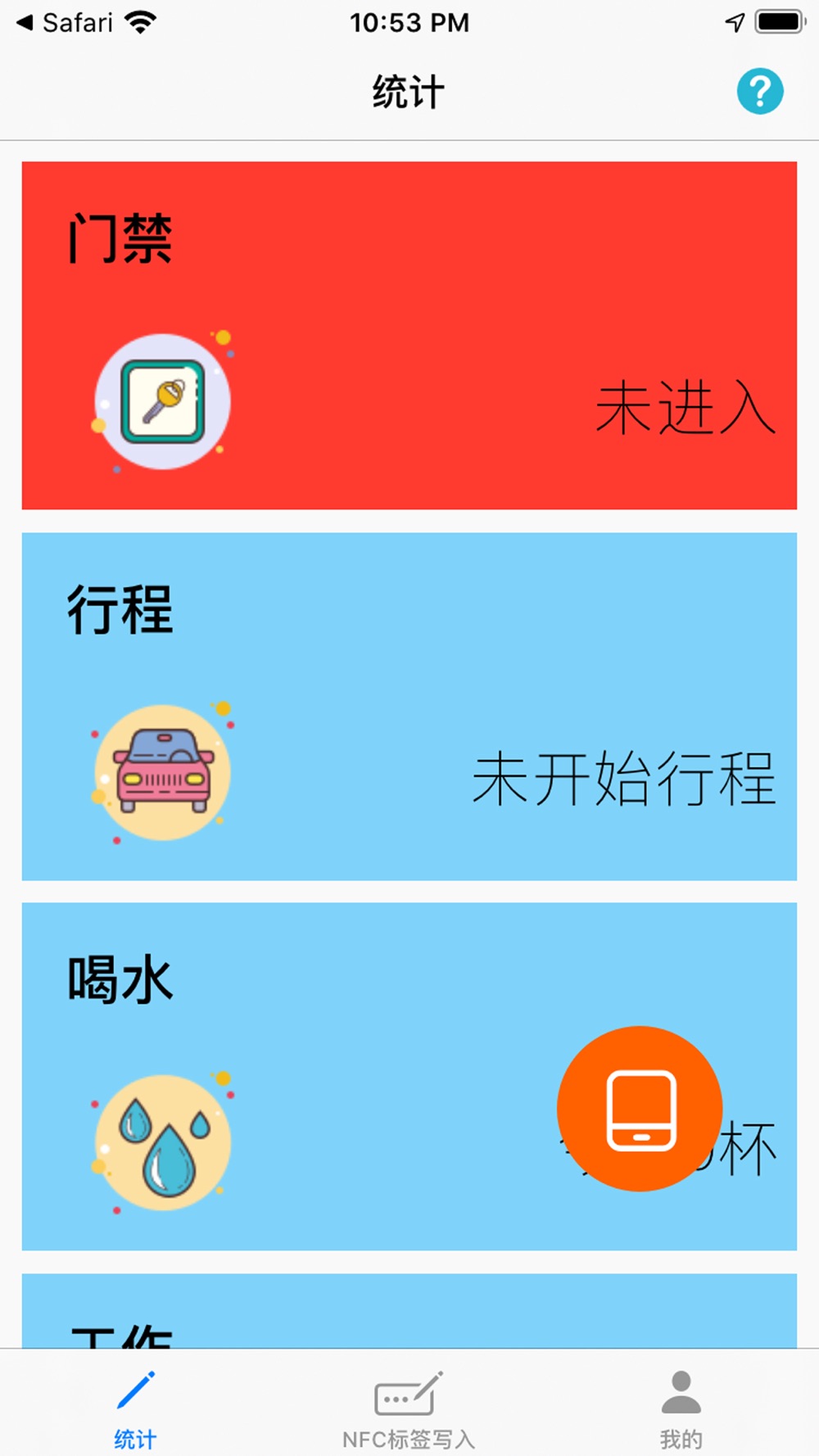 比如:当您想记录自己的出门时间时,您只需要在大门旁贴上一张NFC卡贴,然后使用我们的应用,按照帮助将响应功能写入进卡贴中。下次在您出门时,就可以打开我们的应用,点击读取按钮,贴近卡贴,等待一下震动,一切就都完成了,您的出门时间已被我们准确记录。