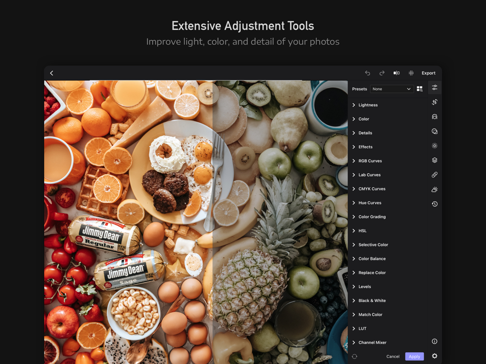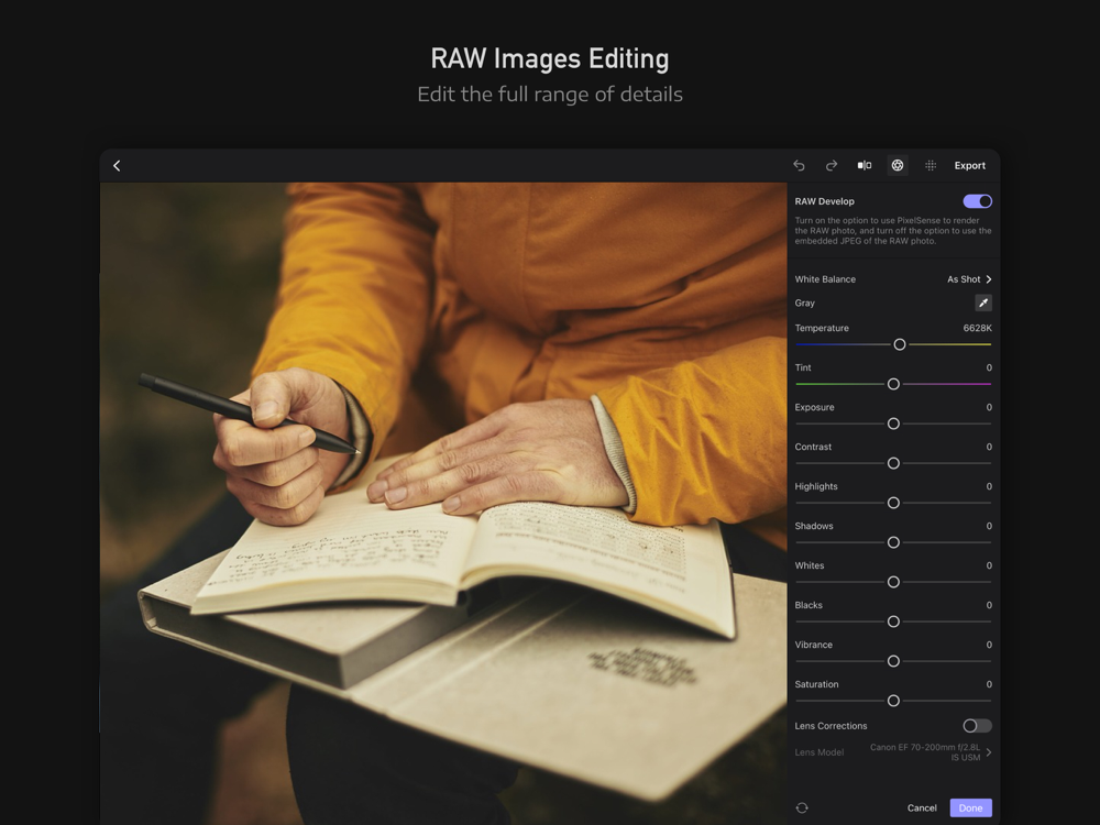Pixelsense is a complete and professional photo editor. It's designed exclusively for iPadOS and provides a series of desktop-class photo editing features. It supports editing RAW camera files.