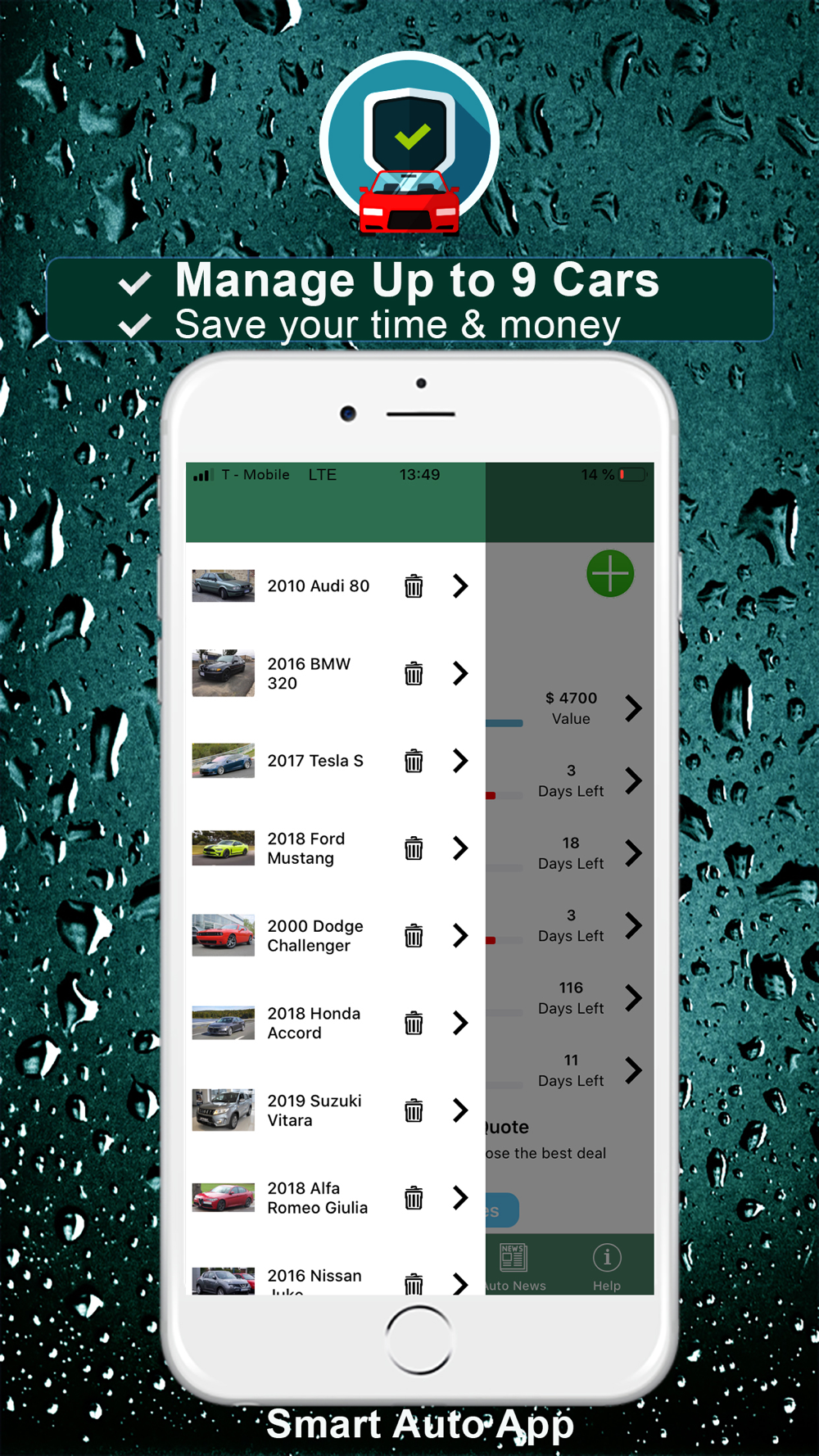Get smart assistant to set up smart reminders and never miss a service date. It's a very convenient way to plan dates for visiting auto service, making the whole process more reliable. It's amazing, you car save up to 9 cars into your garage! Also this app allows drivers to get auto insurance quotes instantly.