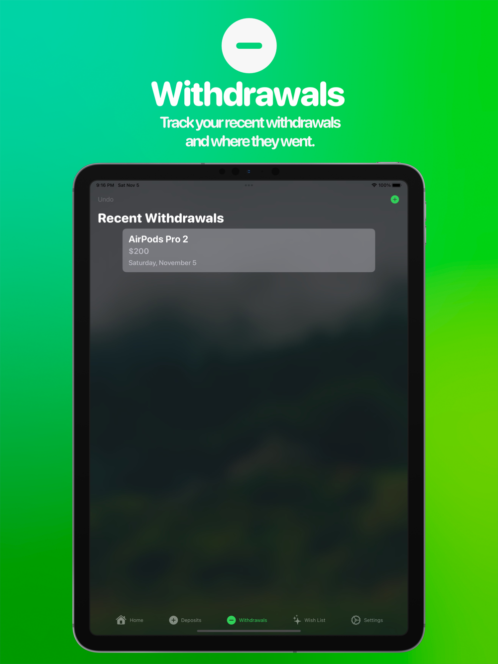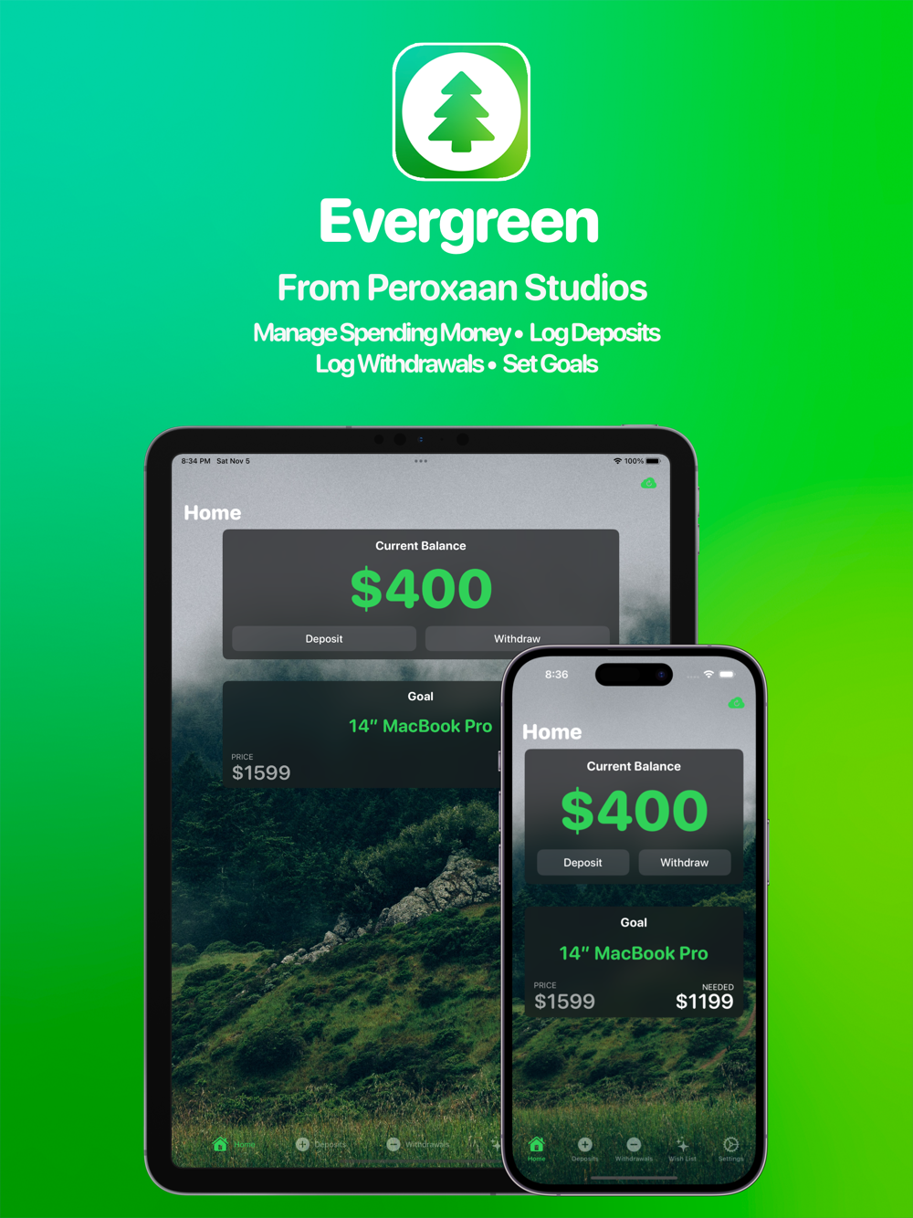 Evergreen by Peroxaan Studios is an easy-to-use finance app that allows kids, teens, and adults to quickly and easily track their spending money. You can also track where that money came from, and what you recently spent your money on. Evergreen is built with savings in mind, and aims to help you meet savings goals.