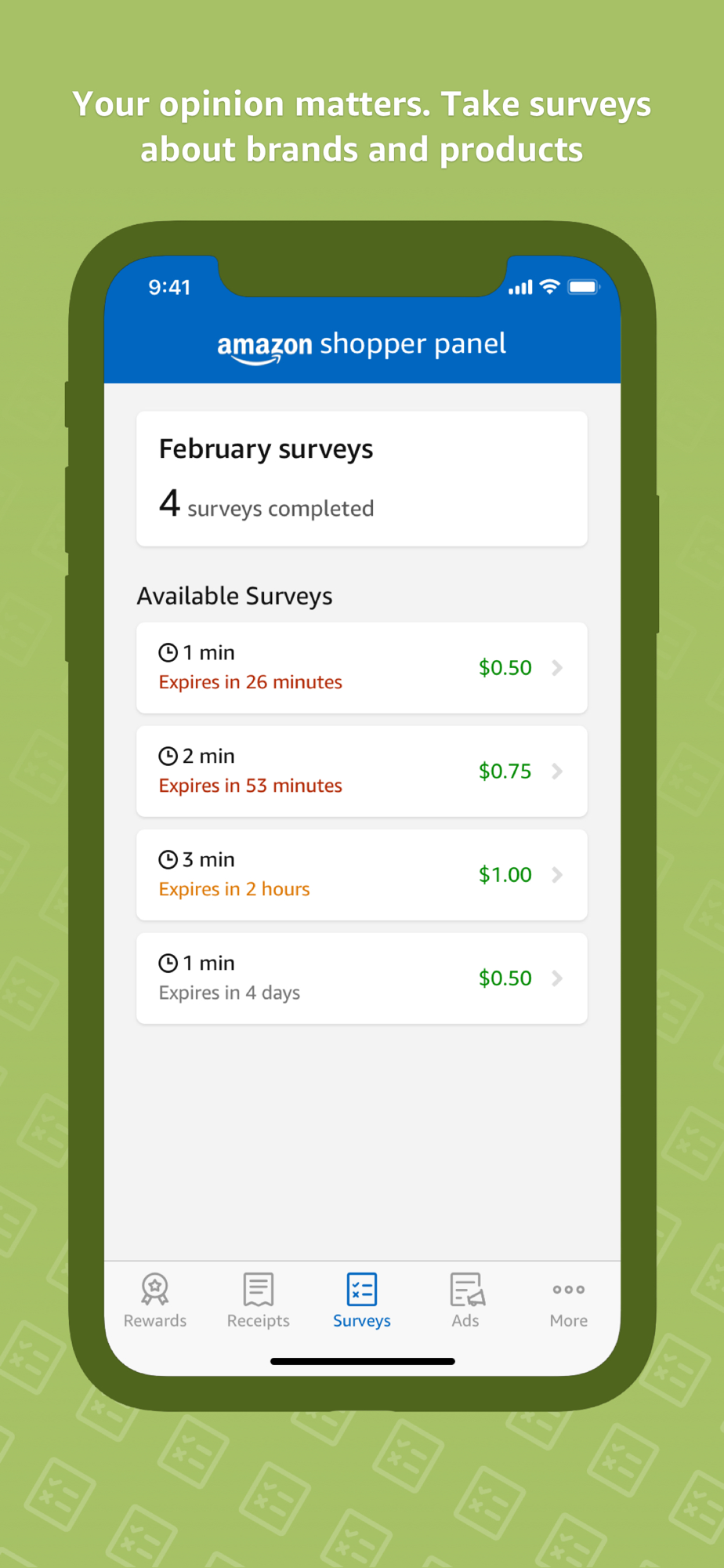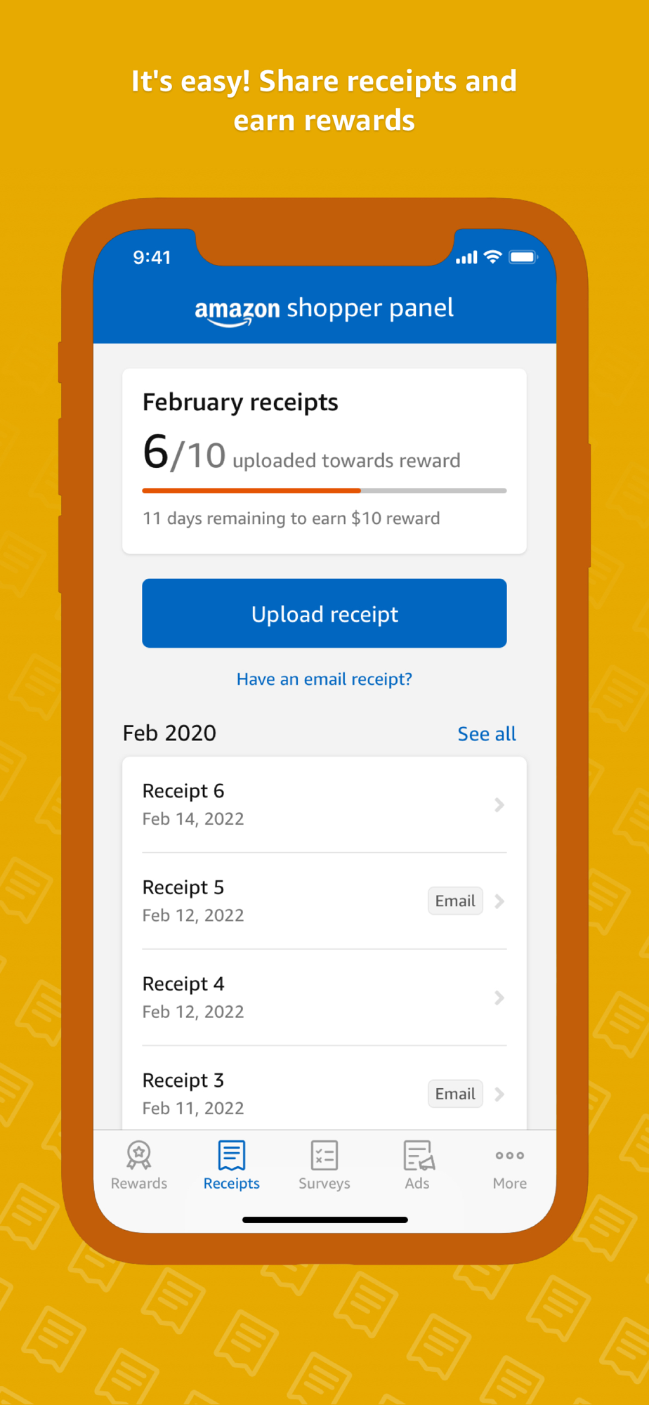 [email protected] and you’ll earn $10 towards either an Amazon Balance or a charitable donation. You’ll earn additional rewards each month for every survey you complete or if you enable ad verification. Space is limited and you may only be eligible to participate in certain parts of the program. You can check if you are eligible by tapping on the tabs for Receipts, Surveys, and Ads in the app.