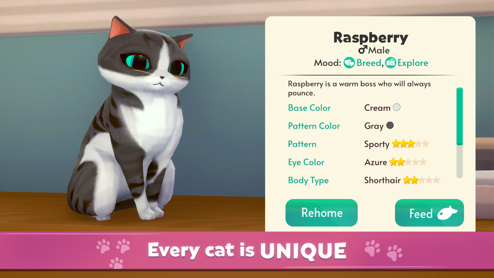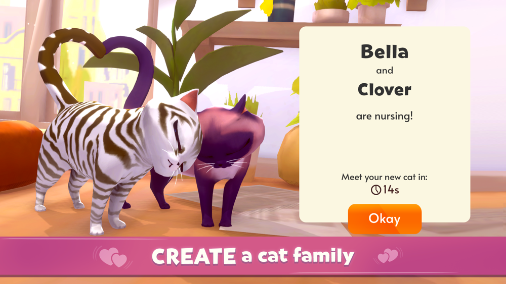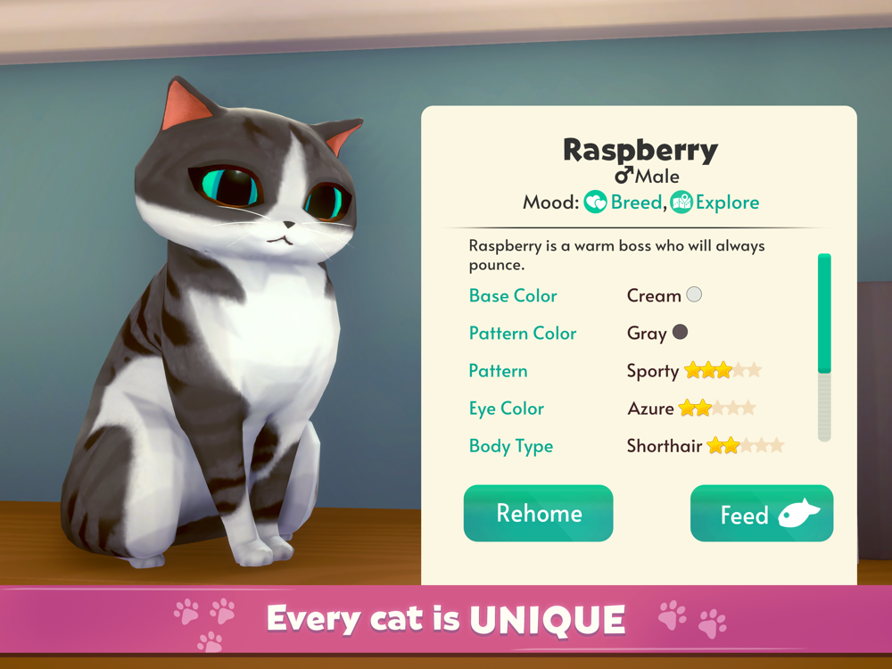 Tabby, calico, or tortoiseshell? Sassy, lazy, or cuddly! Collect and own a variety of unique cats. Lounge out with your kitties and enjoy moments of interaction as they fight for your attention.
