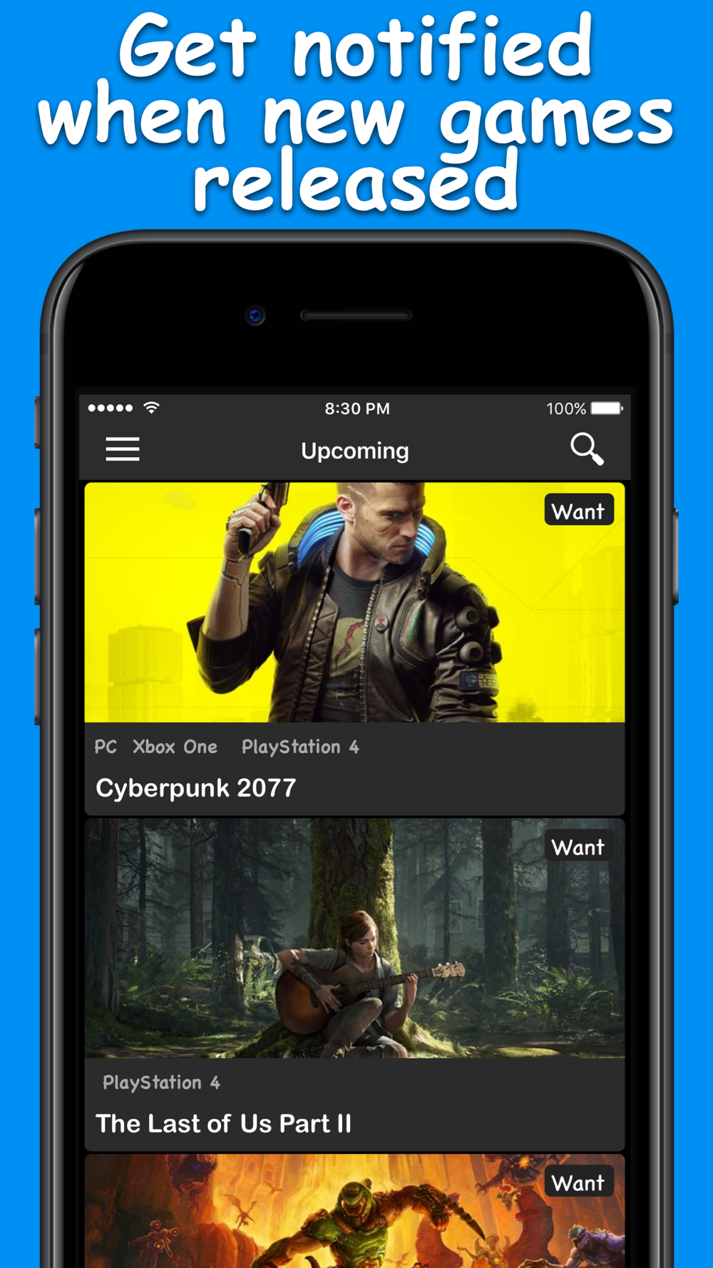 - Complete game information (descriptions, trailers, screenshots, release date, ratings, developers,DLC`s, platforms, achievements, similar games and more)