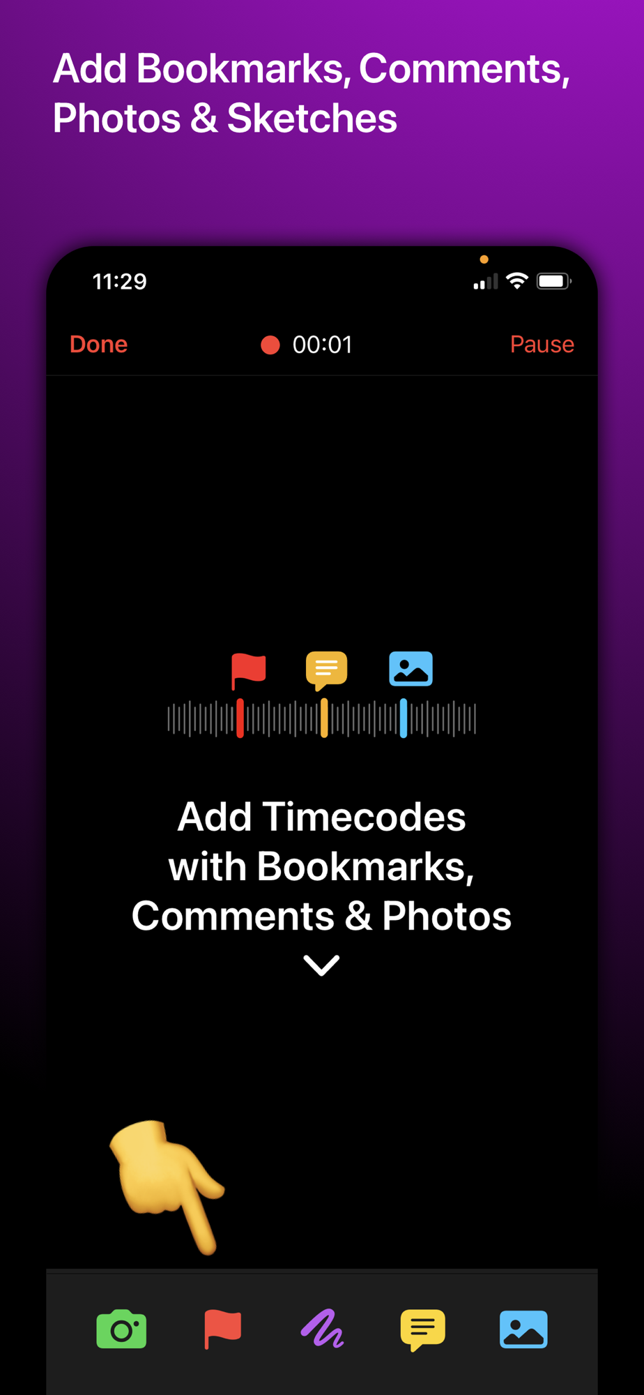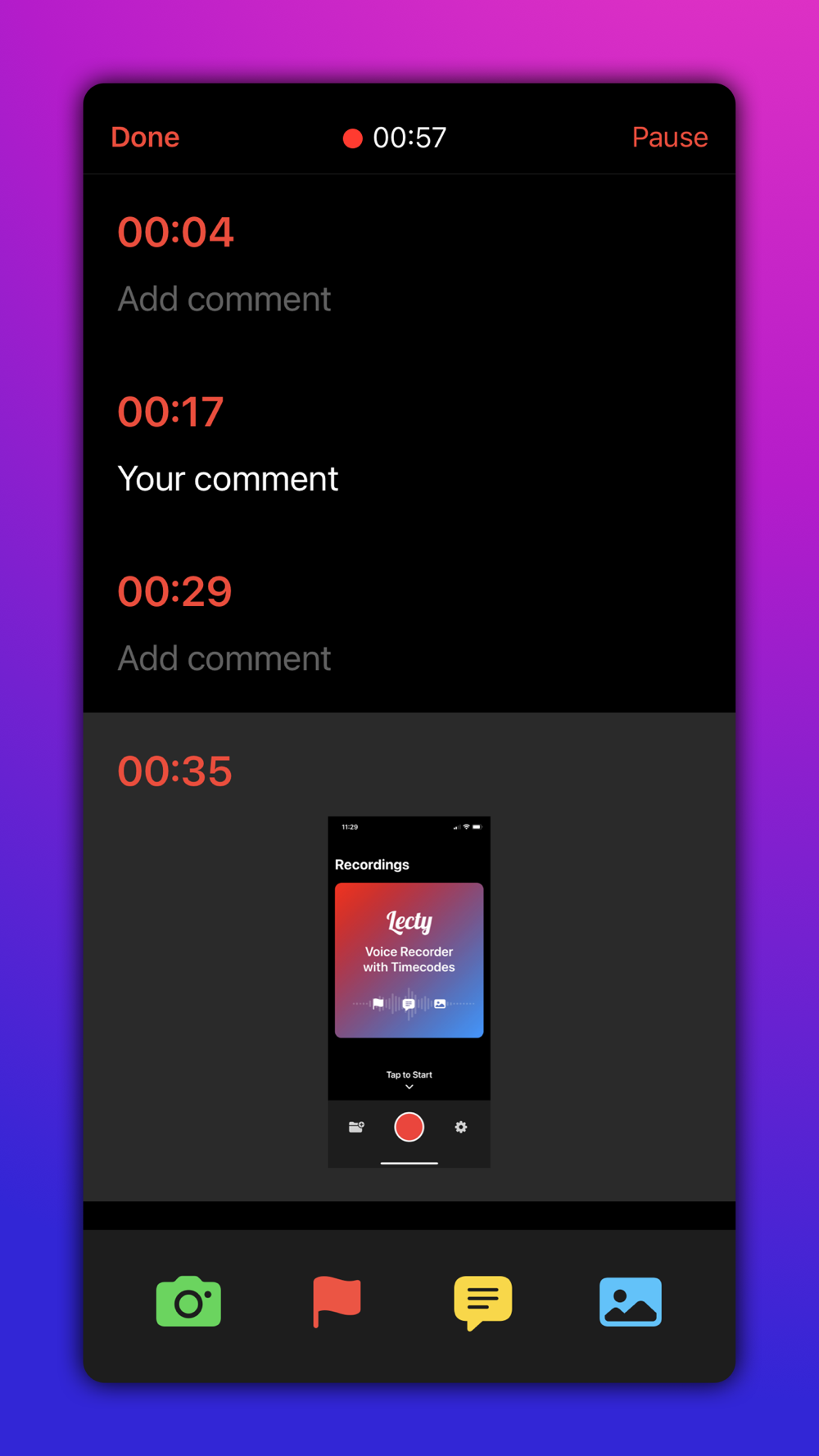 Lecty is a voice recorder with timecodes. As you create and listen to recordings, you can create timecodes by adding bookmarks, comments, and photos. As a result, you get a visual transcript of the audio recording, consisting of bookmarks, photos and comments, each of which is tied to the time they were added. Using the created timecodes, you can quickly navigate your recordings and instantly rewind the recording to the desired section by simply clicking on the desired timecode. Do you want to start listening to the recording from the moment you added a comment or photo? Just click on the timecode and listen.