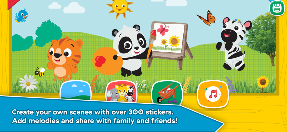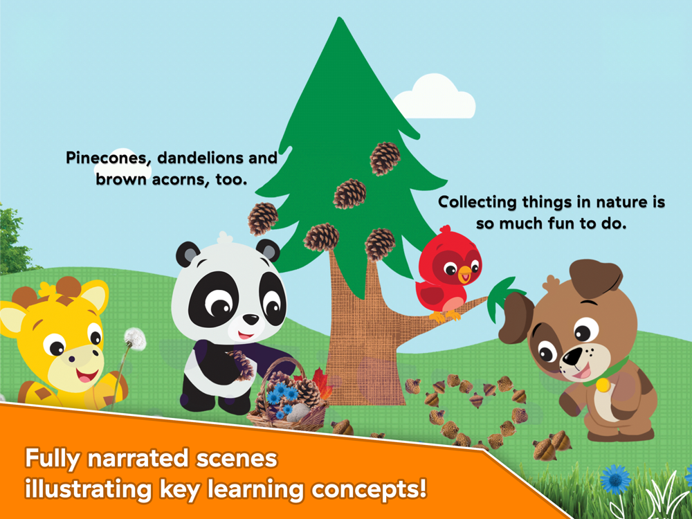 - 12 Fully narrated stories illustrating key early-learning concepts with adorable, animated animal characters