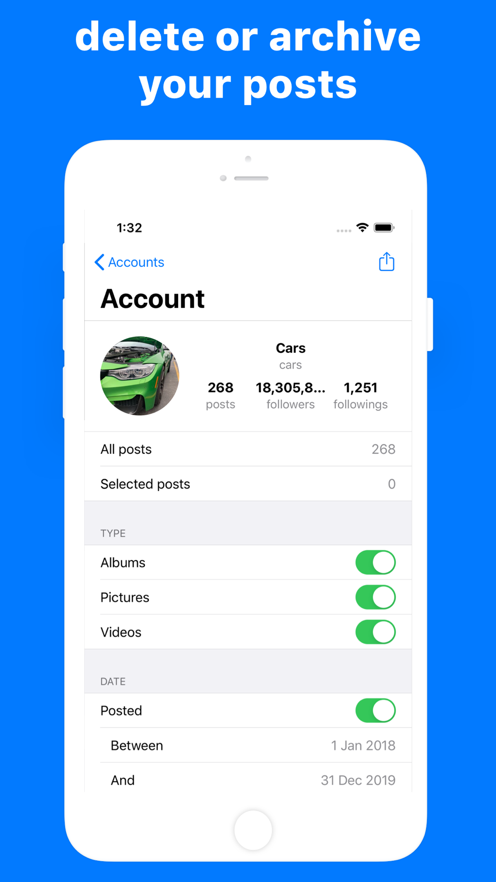 This app offers an easy and intuitive experience. Just sign-in your Instagram accounts and start archiving or deleting your posts.