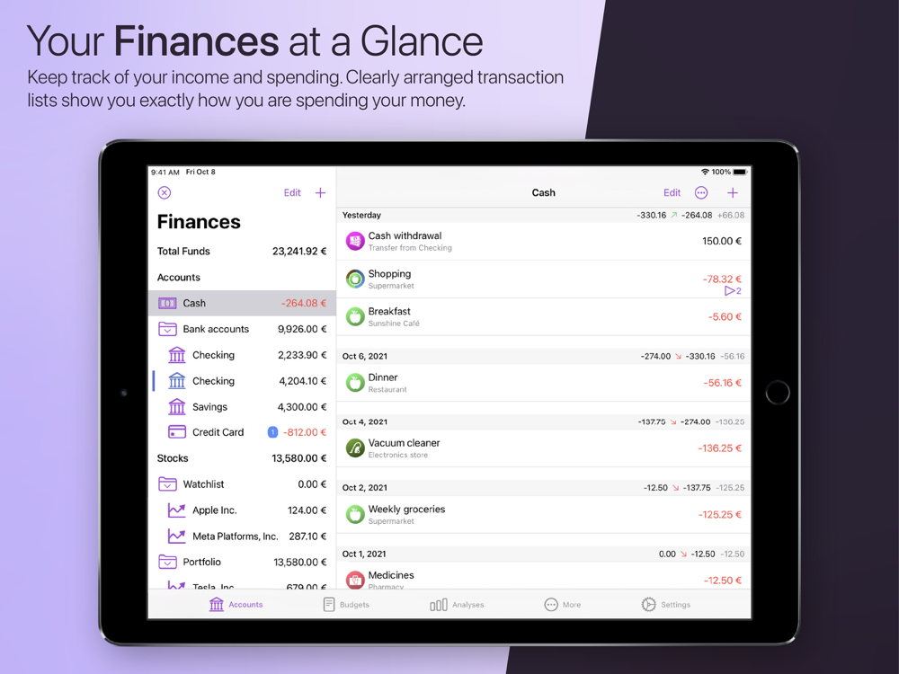 iFinance 5 is available for Mac, iPad, and iPhone. When you buy the Mac version, you automatically get the iOS and iPadOS versions with your purchase – and vice versa. Please note: iFinance 5 is no longer available for Apple Watch.