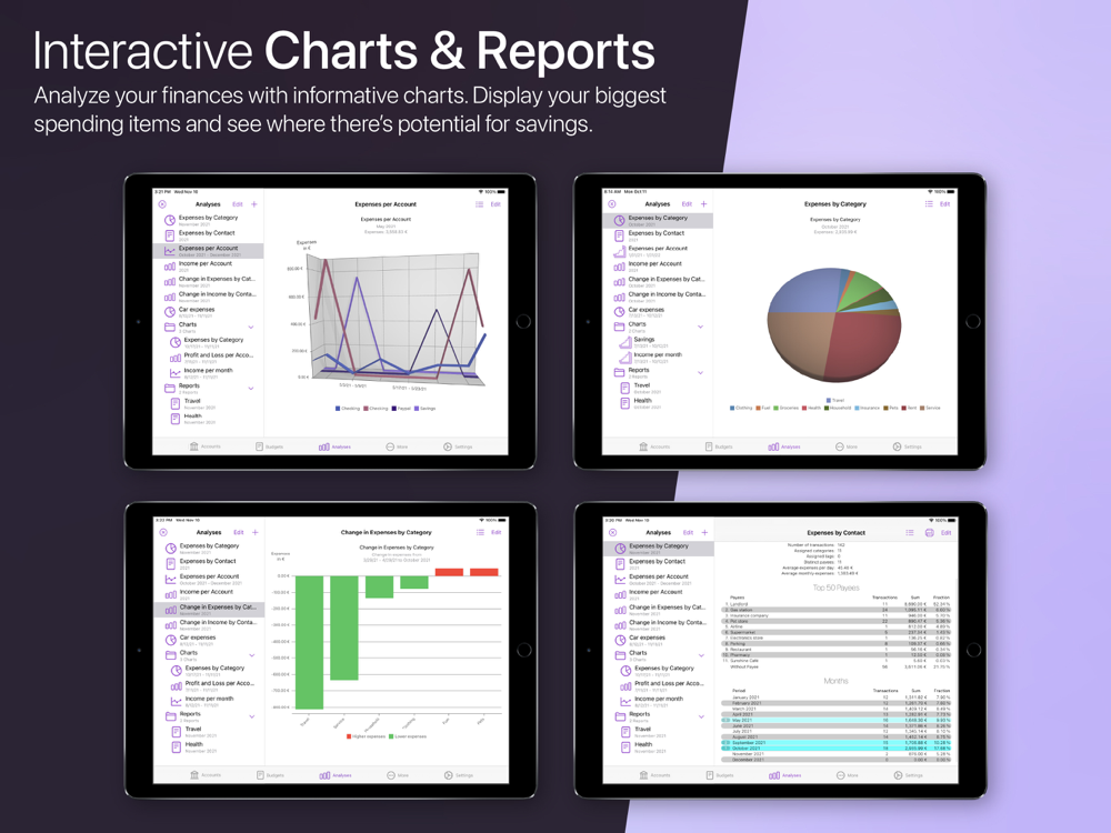 Want to find out how your assets are performing? Or why you keep maxing out your bank account each month, leaving you to wonder where your salary actually goes? Is it current expenses such as rent, insurance, food or loans? iFinance has all the answers. It can analyze your finances and helps you identify your biggest spending items and any categories with saving potential.