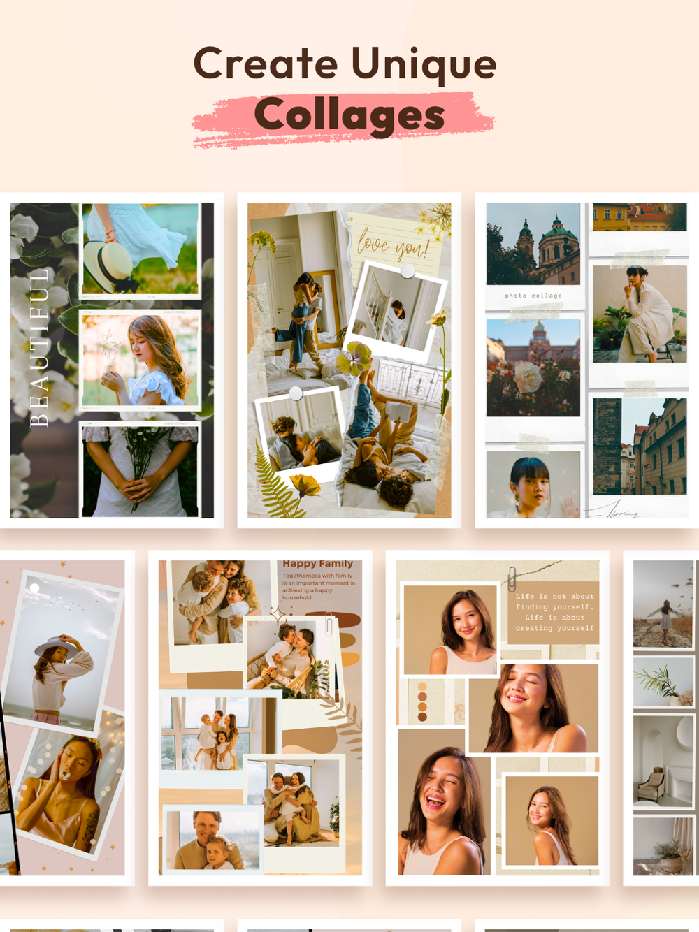Add creativity right now! Choose any of your photos from the gallery and appropriate template of the grid, go to the editor mode, add bright accessories, share with friends and subscribers and enjoy the popularity in the social net.