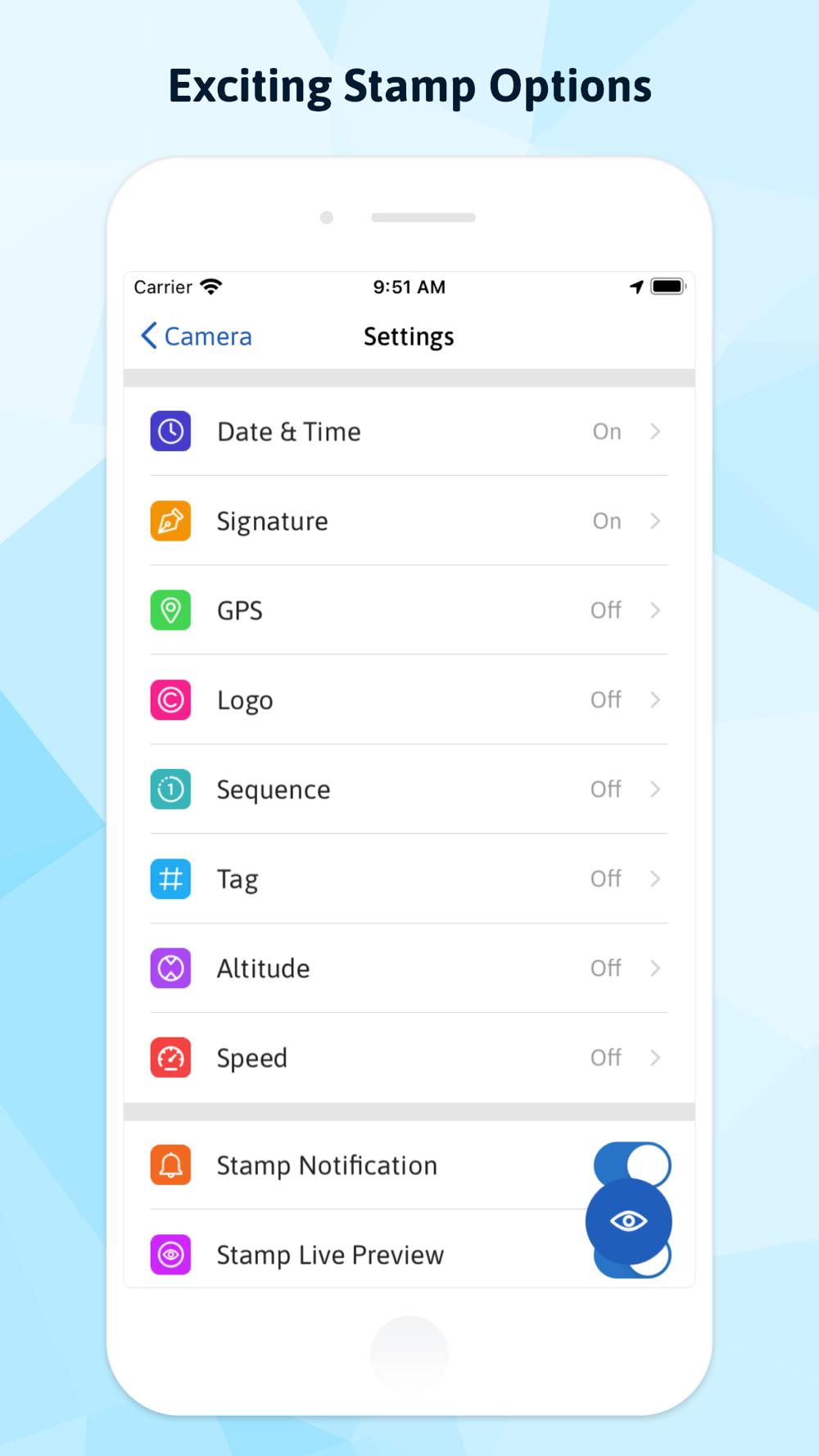 This Timestamp camera with Location App has user-friendly built-in custom camera settings comprising Ratio, White balance, Grid, Timer, Focus, Compass, Flash mode & Mirror front camera.
