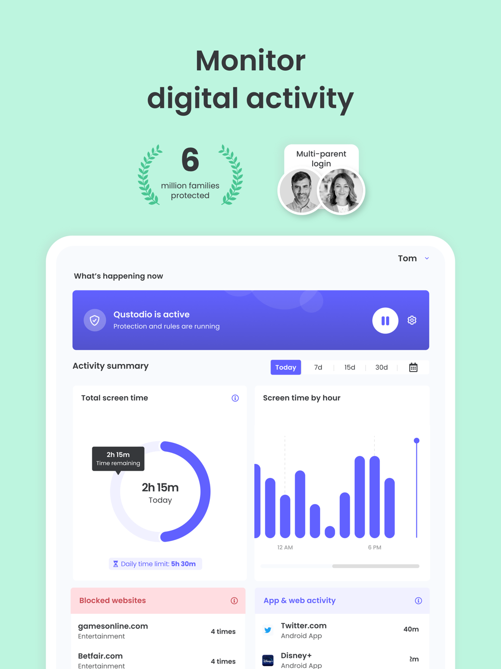 Awarded PC Mag’s Editors’ Choice for best family parental control & screen time app, Qustodio Parental Control App makes parenting easier with screen time limits, games and app monitoring, app blocking, location tracking and the most advanced reporting.