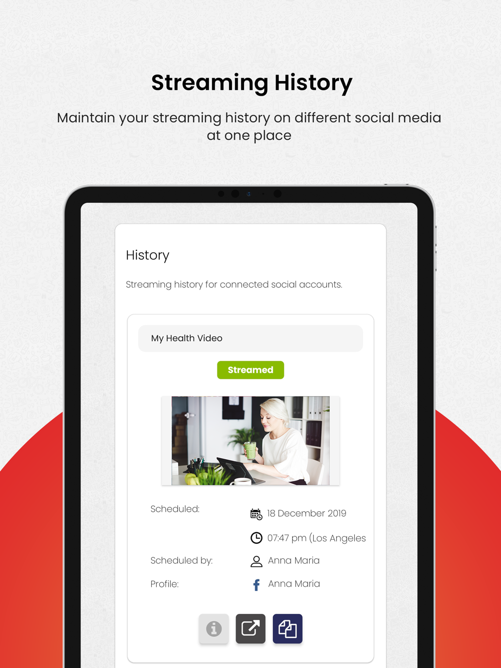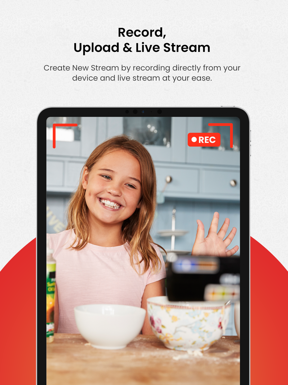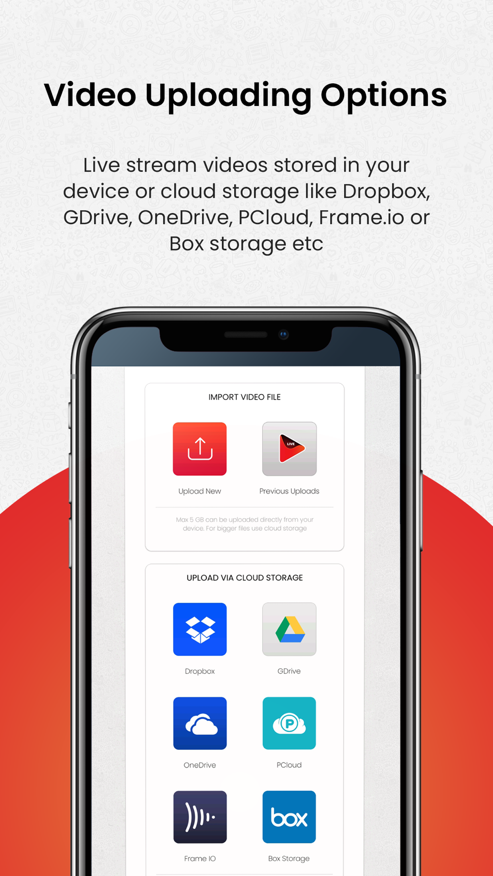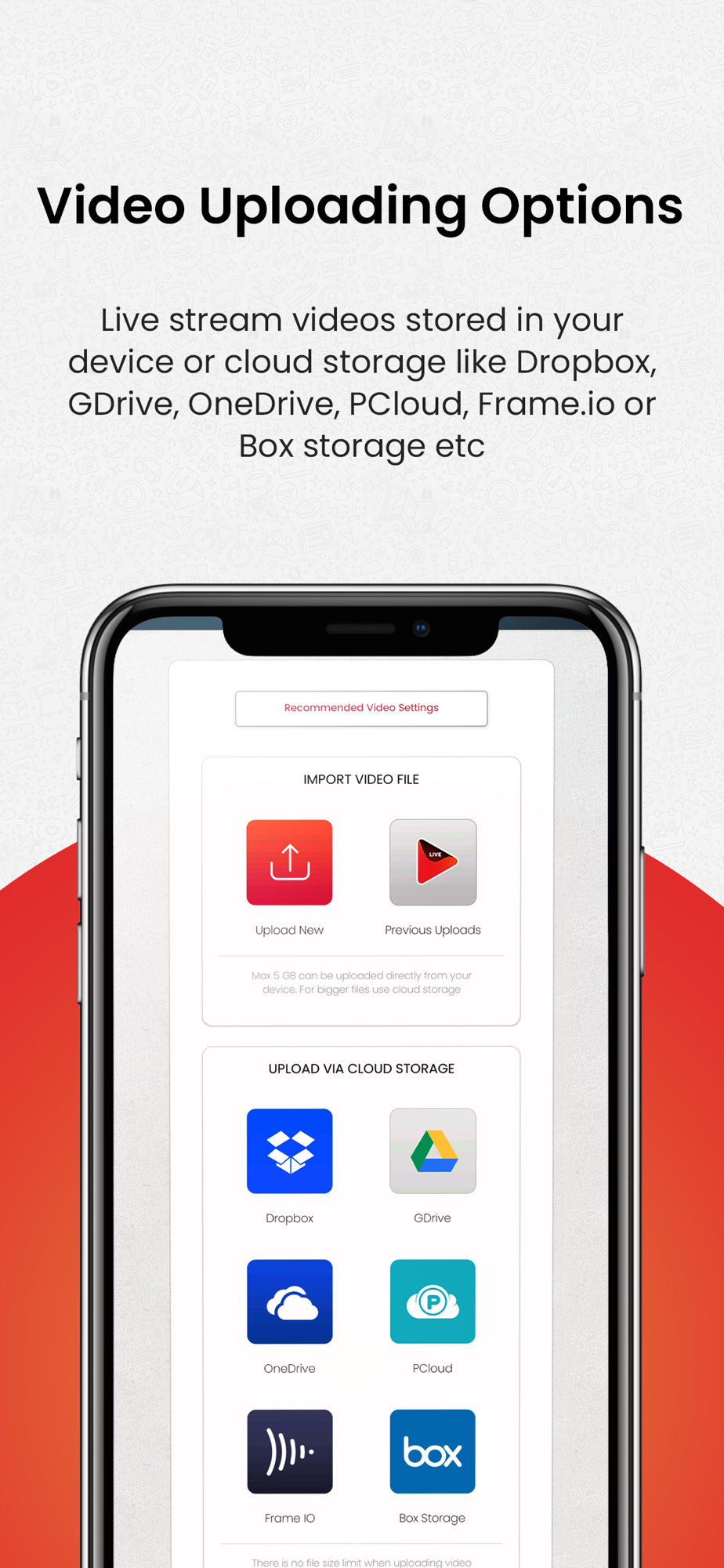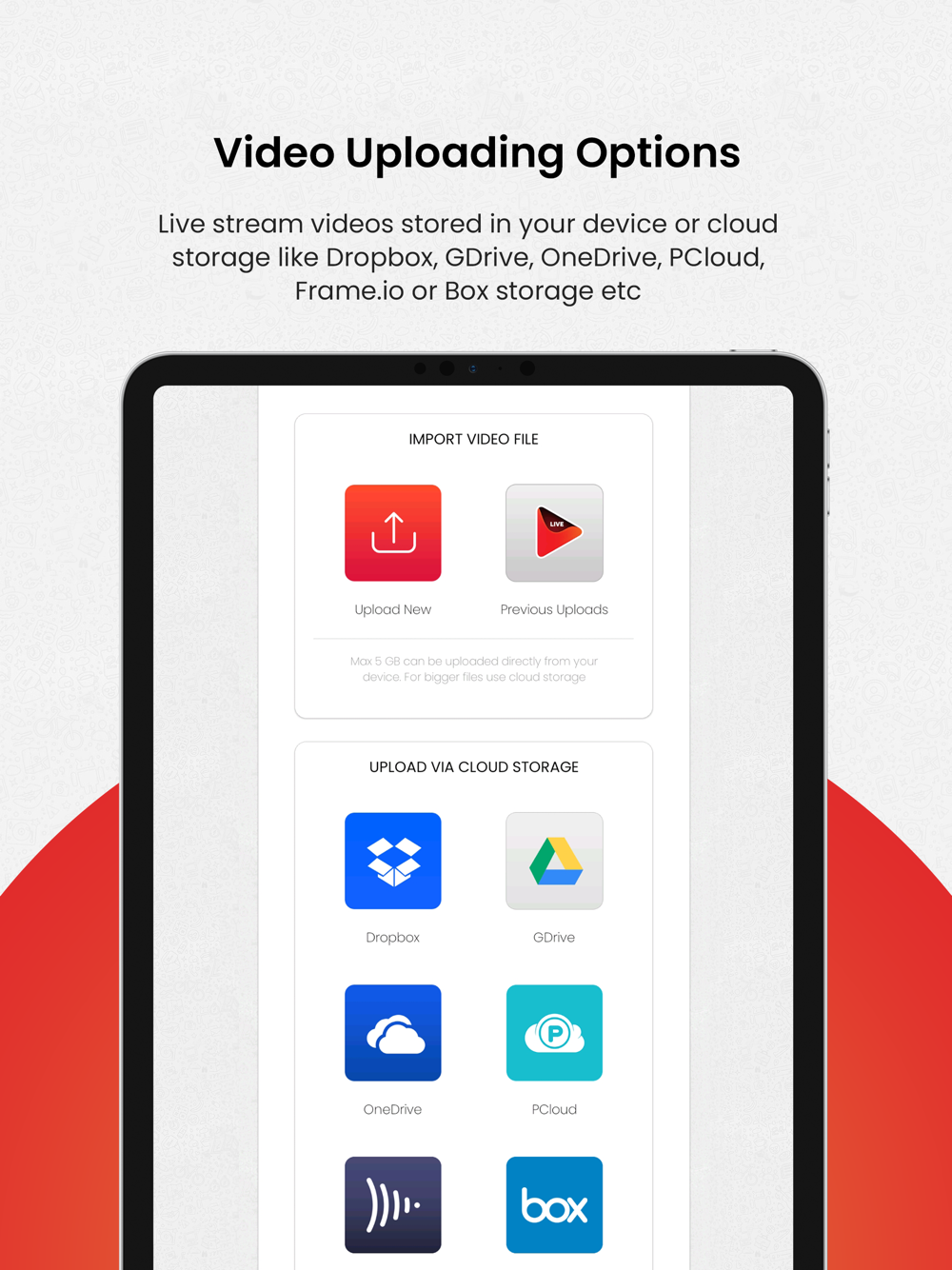 • Recorded Streaming: Record video via camera, use video from gallery or import videos from your cloud storage to stream