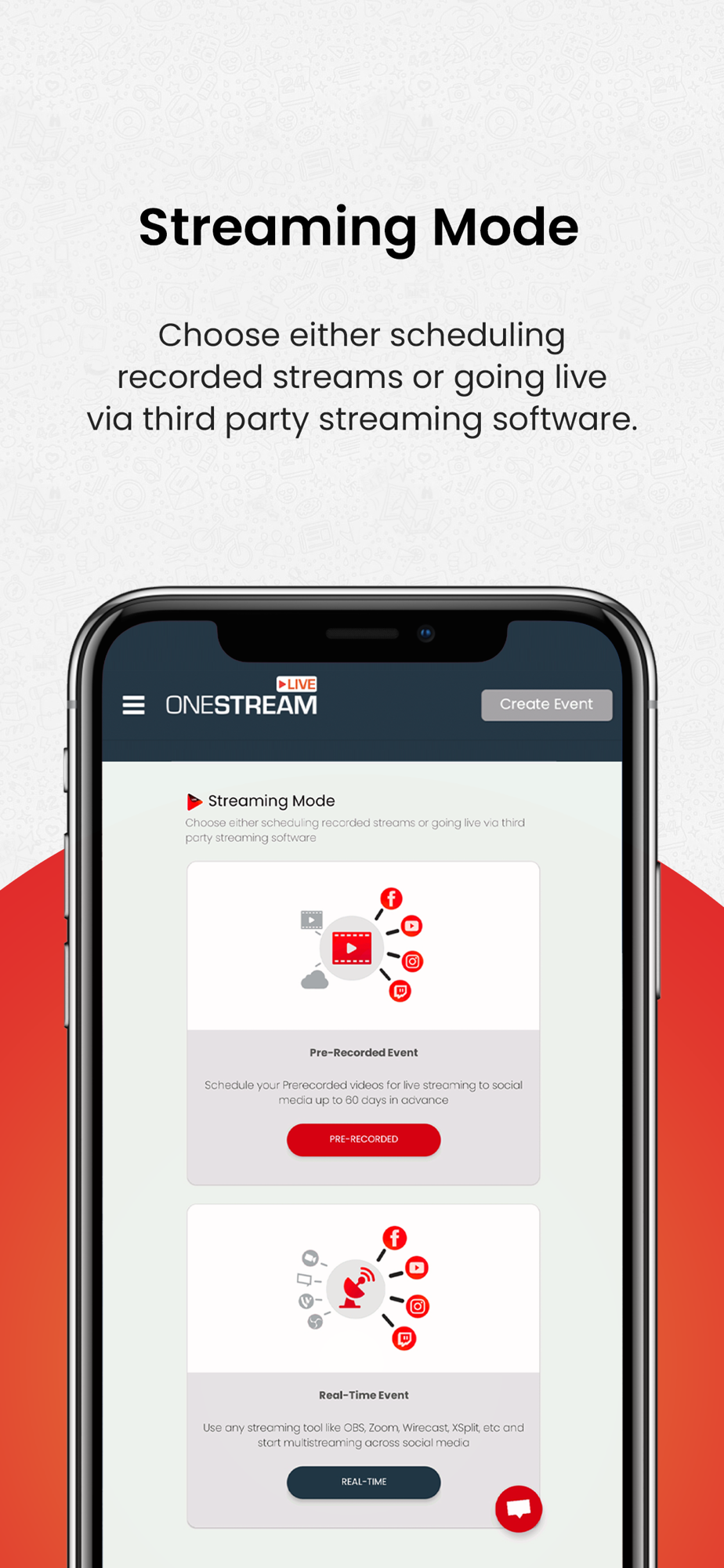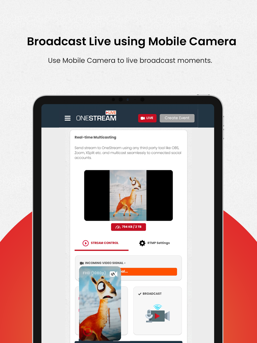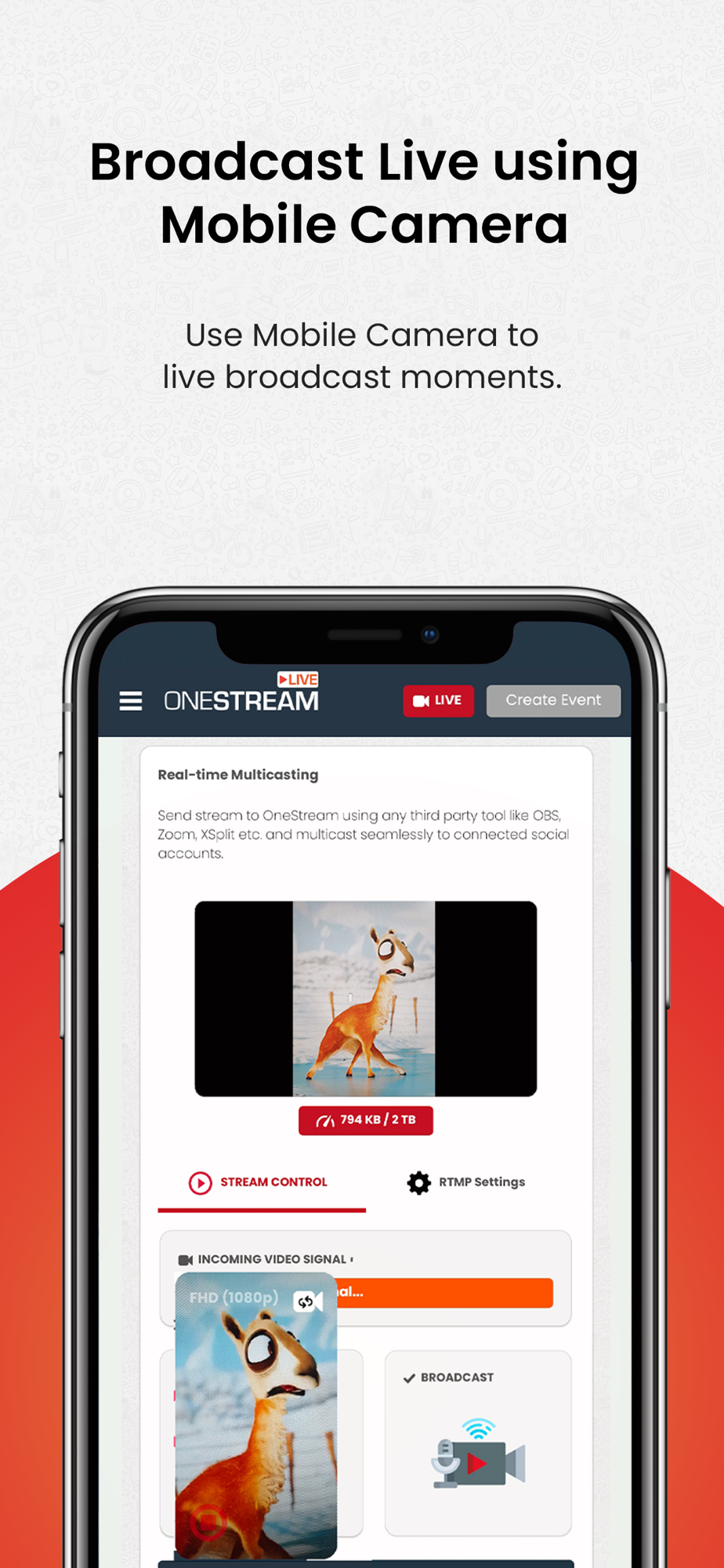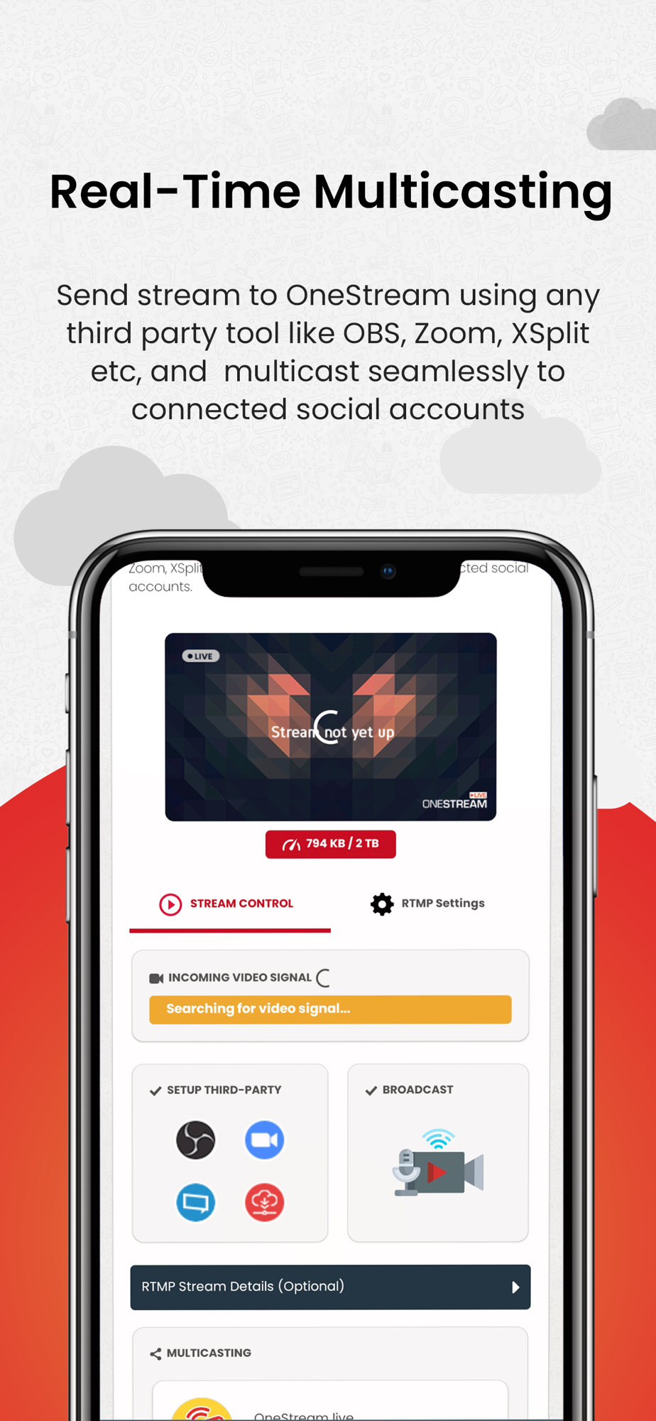Use your mobile camera or any third-party tool to stream to OneStream and restream to multiple social media streaming destinations at the same time.