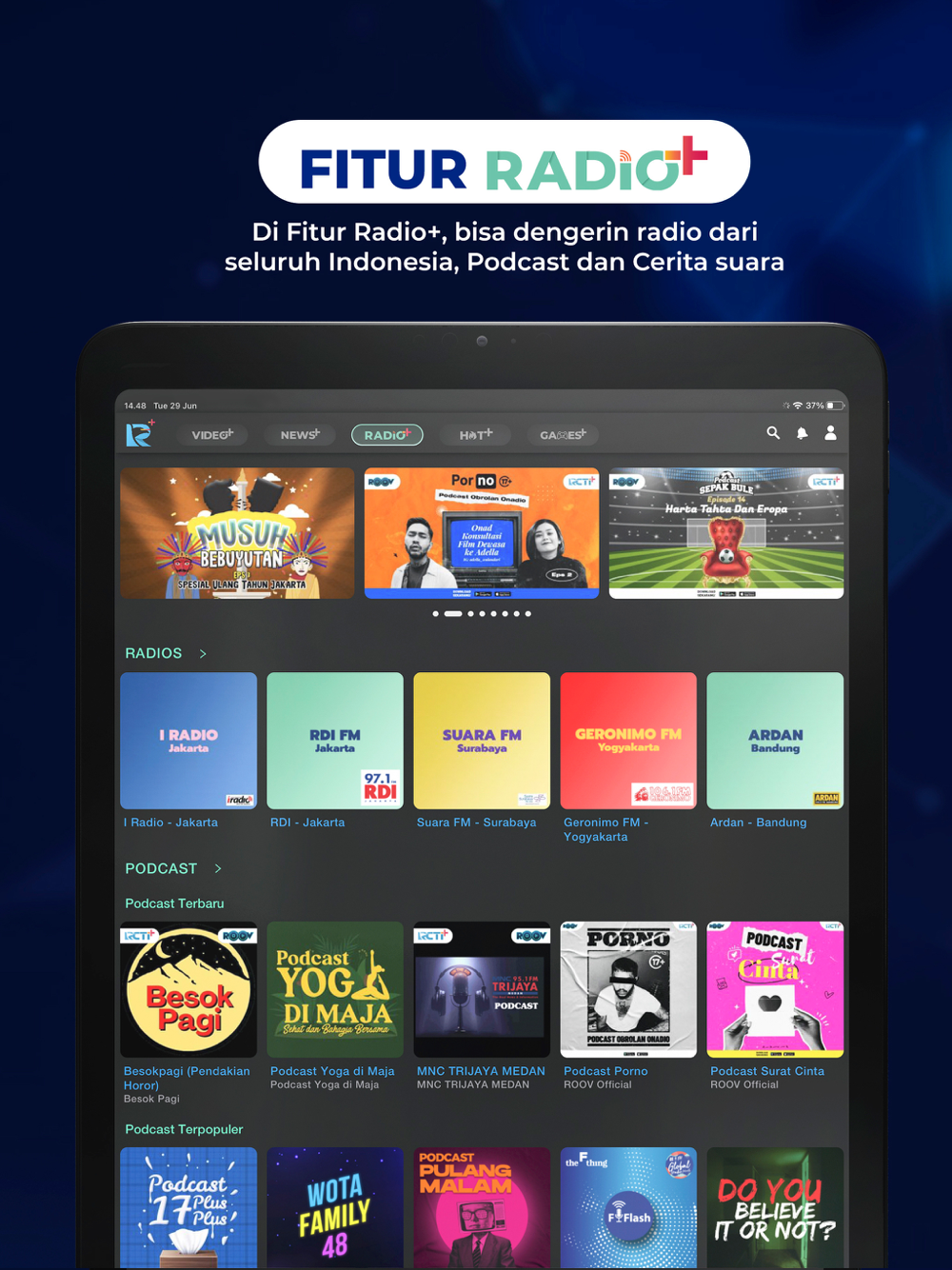 Radio streaming kita memiliki seluruh audio nasional dan beberapa audio internasional. Selain itu juga terdapat berbagai macam podcast pilihan sesuai dengan selera seperti podcast Kata Dochi, Podcast Chat Plus, Podcast Horor Experience. Tidak hanya itu saja, ada drama radio atau Cerita Suara yang terdapat di Radio+ diantaranya cerita suara yang populer yaitu Tutur Tinular, Mahkota Mayangkara dan Home Of Horror dengan konten cerita suara lokal urban seperti Beranak Di Alam Kubur, Bulu Kuduk Universe, Payung Merah jembatan Cibubur, Kutukan di Kolong Casablanca dan Misteri Rumah Pondoh Indah.