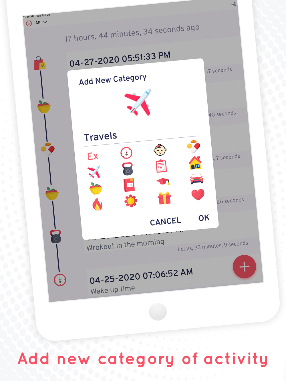• Available categories: All, Default, Baby, Book, Food, Gym, Home, Pill, Travel , Cap , Car , Flame , Flowers , Gift , Heart , Hospital, Map , Money , Movie, Music, Night , Pet , Phone , Pizza, Shopping Bag, Sport, Stop Watch, Train, Water, Weather