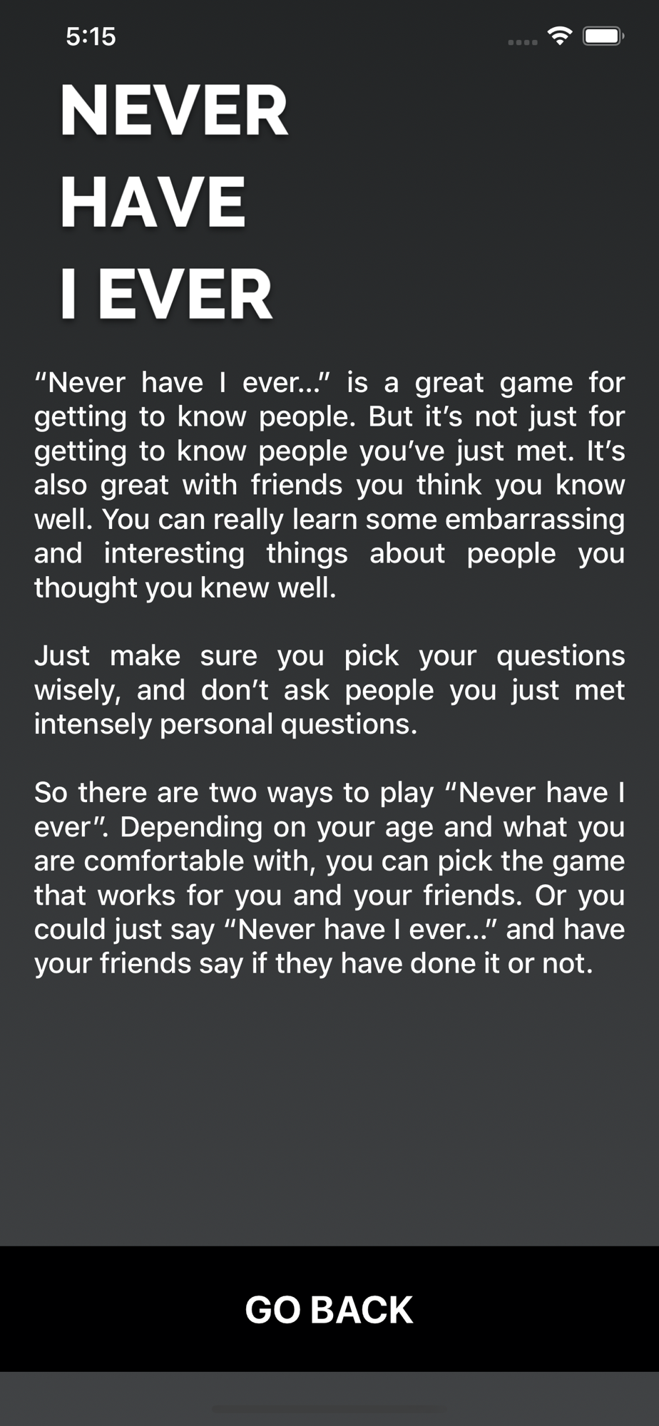 Never Have I Ever is a fun party game which is perfect to get to know your friends better. It’s the must have app for friends and couples!