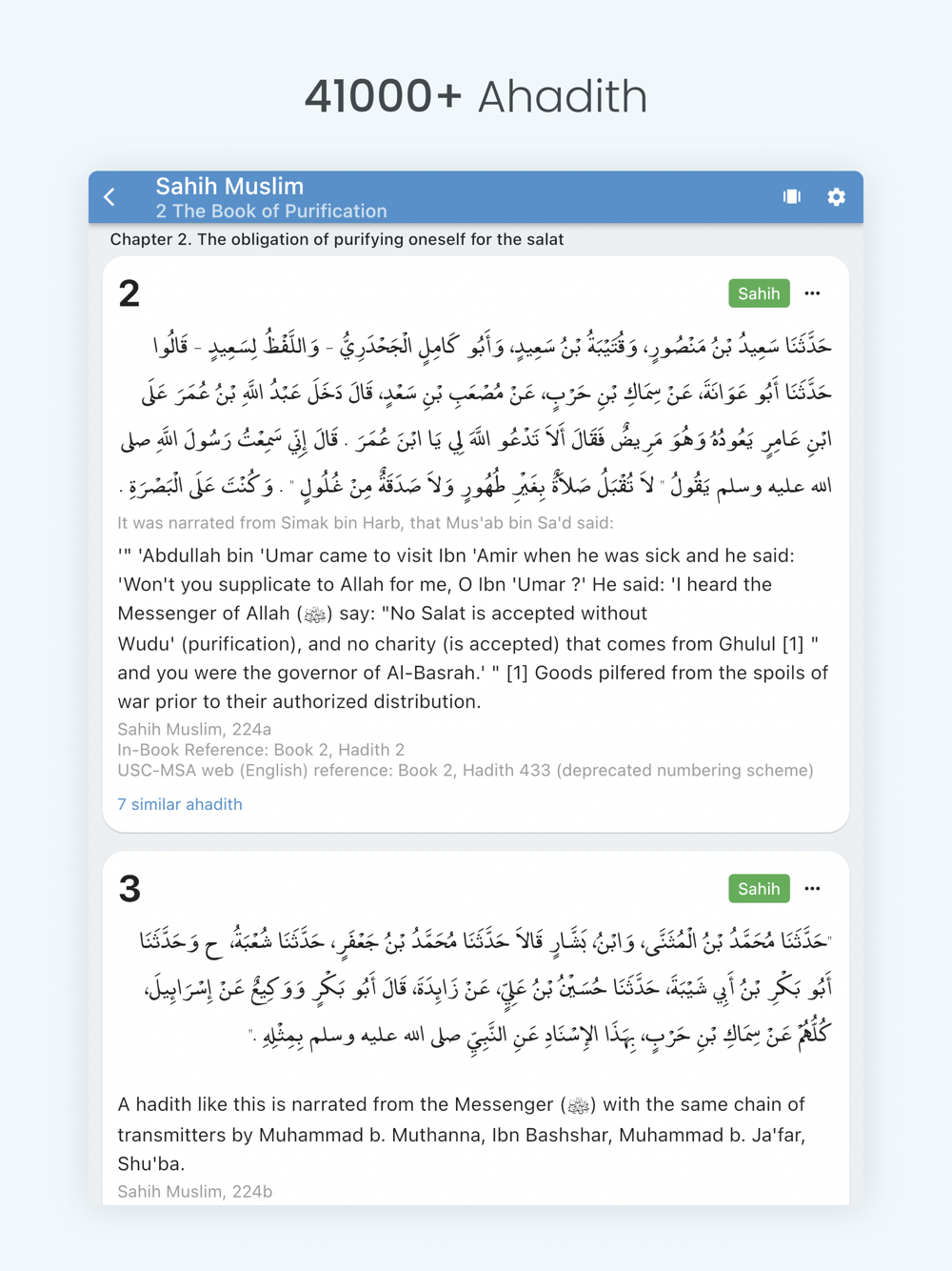 ● The Hadiths included in the App are in Arabic & English Language ONLY. Although we would love to add more languages, we don't have the required hadith databases for other languages.