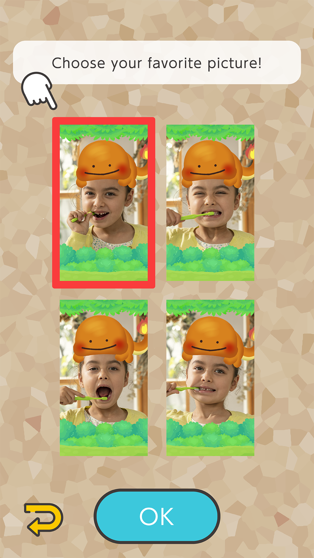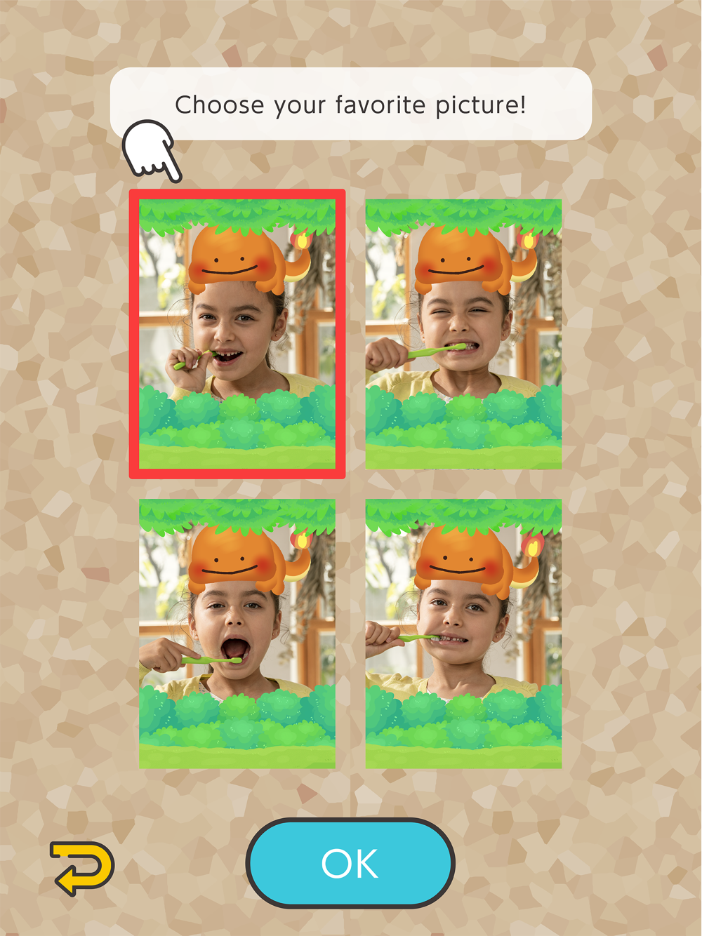 While you brush, you can let the game snap a few photos of your great brushing in action. Choose your favorite shot and then have some fun decorating it with a variety of stickers! Keep brushing your teeth daily, and you’ll continue to collect more stickers you can use to decorate your photos.