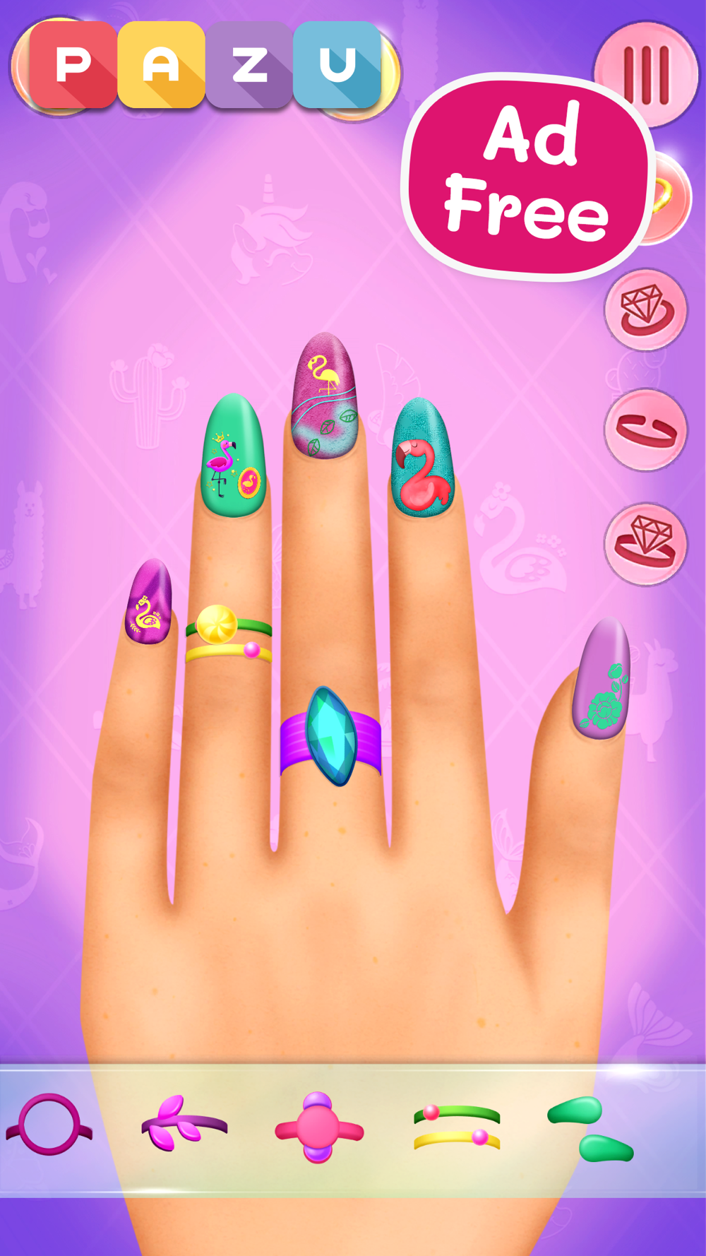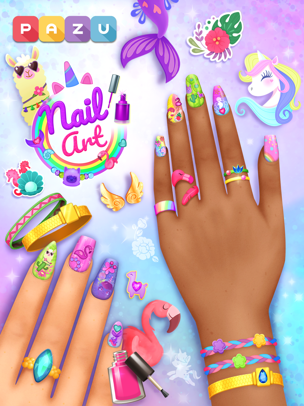 Get your nails done on the Nail Art Salon with 4 beautiful themes: Flamingo, Llama, Mermaid and Unicorn, each with its own unique nail shapes, nail polish colors, gradients and glitters, amazing textures, patterns and shapes, awesome stickers and gems.