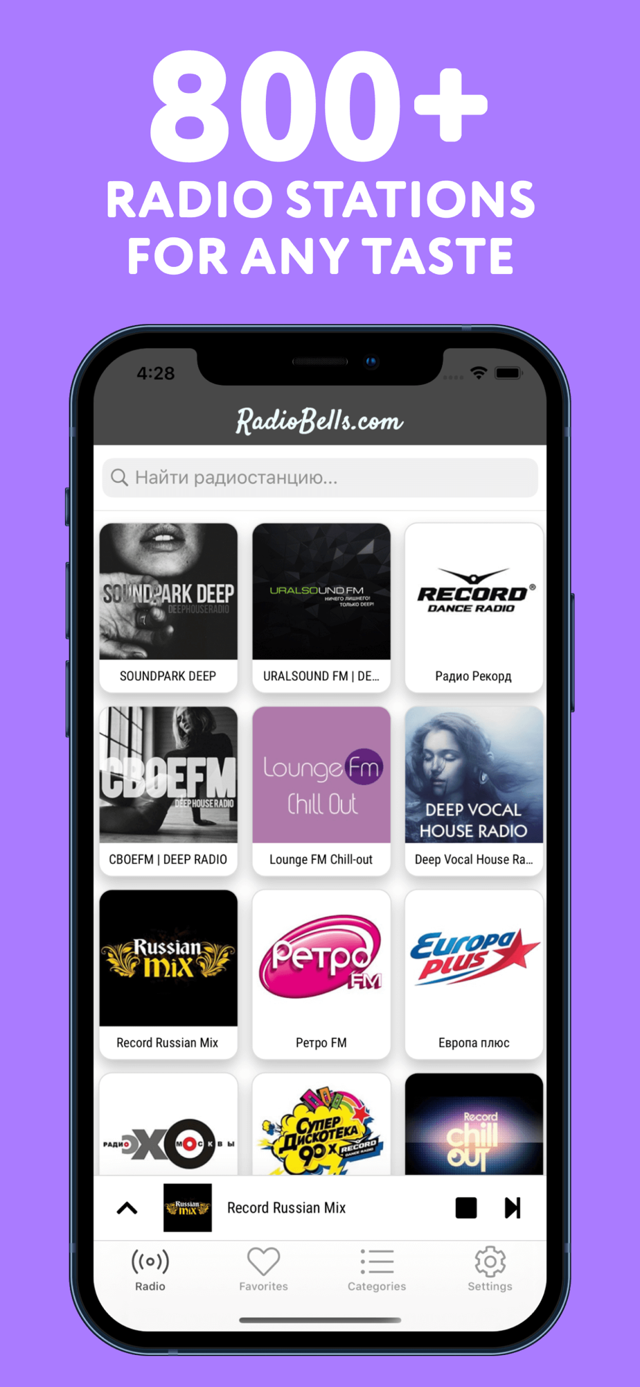 To help you navigate through the diversity of stations, the application is divided into 14 categories (Rock, Club, Deep House, Chanson, Trans, Pop, Retro, Relax, Hip-Hop and Rap, Conversational, Folk, Classic, Jazz, Kids). There is also an easy transition between the radio of the selected category when listening to it.