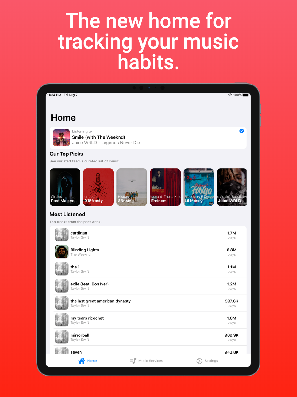 Gone are the days where you need to impatiently wait until the end of the year to see which artists and songs you listened to the most. With TuneTrack, you can get that data on-demand at any time with the click of a button! TuneTrack gives you access to statistics like top tracks and top artists with numerous ways to filter, such as time period and release date, with support for some of the most popular music platforms like Apple Music, Spotify, and Last.fm. TuneTrack comes with a multitude of additional features, including, but not limited to: