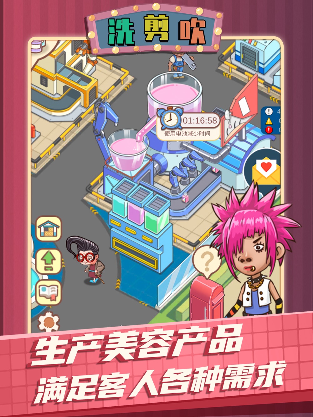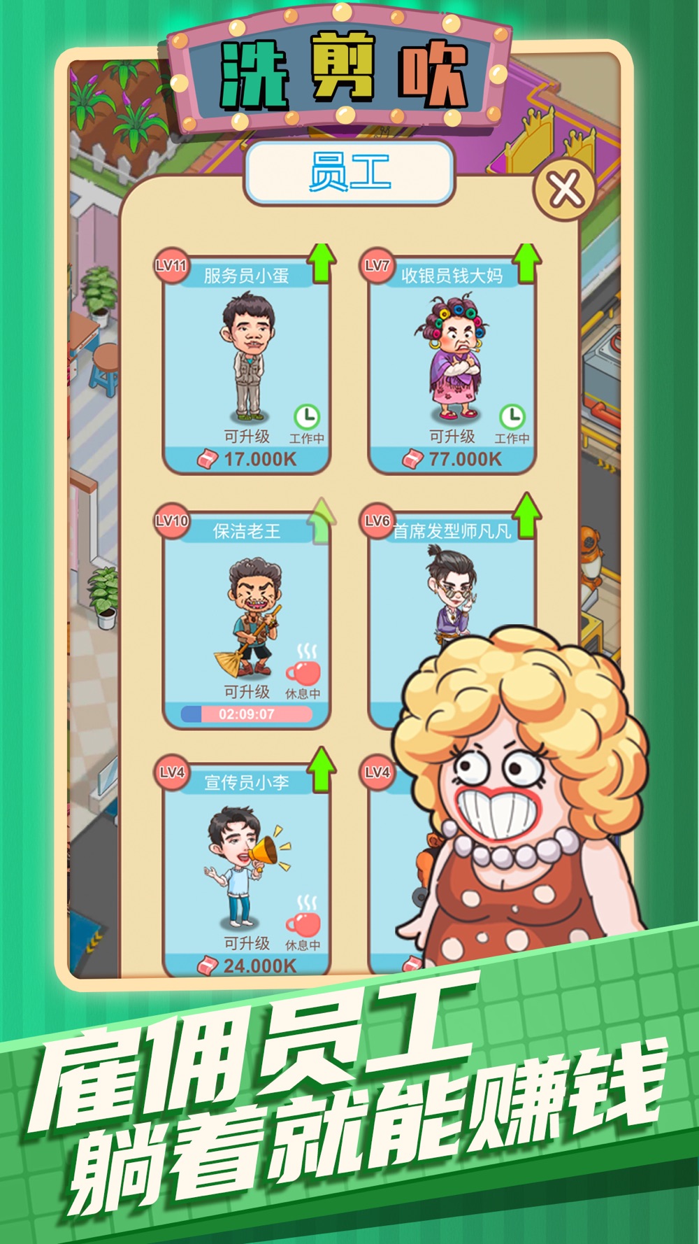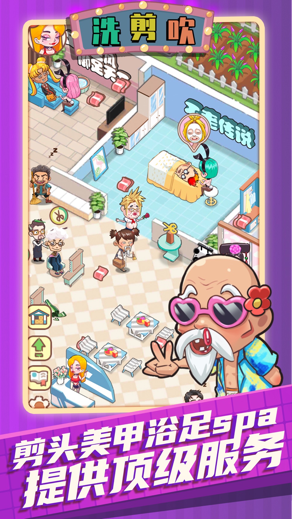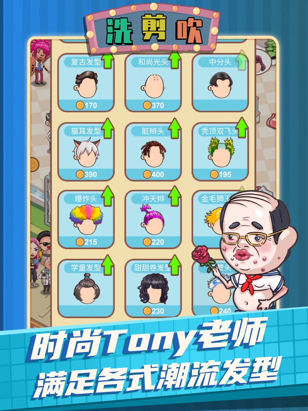 洗剪吹美容美发店正式开业啦~!这是一款超棒的模拟经营游戏!时尚Tony老师是你的得力助手,解锁各种潮流发型,吸引顾客,满足他们的需求!还有浴足、美甲、SPA等一条龙服务!雇佣员工帮忙打理店铺,老板只需要躺着就能赚钱!制定你的经营计划,打造时尚潮流店铺吧!