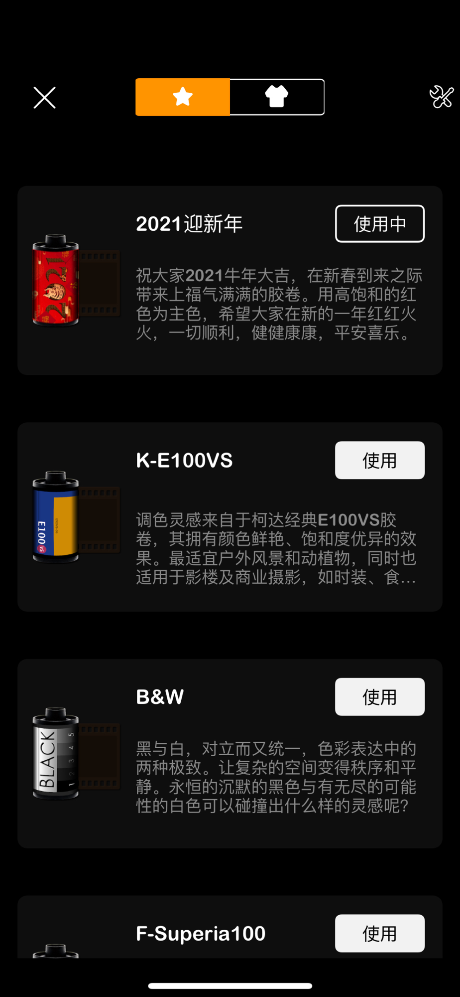 ・目前APP推荐定制多达15款滤镜,未来会持续做更新支持。有糖果色的清新小可爱,怀旧风格的1943,黑白刻印的B&W,科技感反乌托邦的赛博朋克,也有尽力去还原Kodak和FUJI的经典胶卷颗粒,游戏像素风格的PIXEL,以及经典的黑金和青橙。剩下的就不在剧透了,希望你能喜欢。