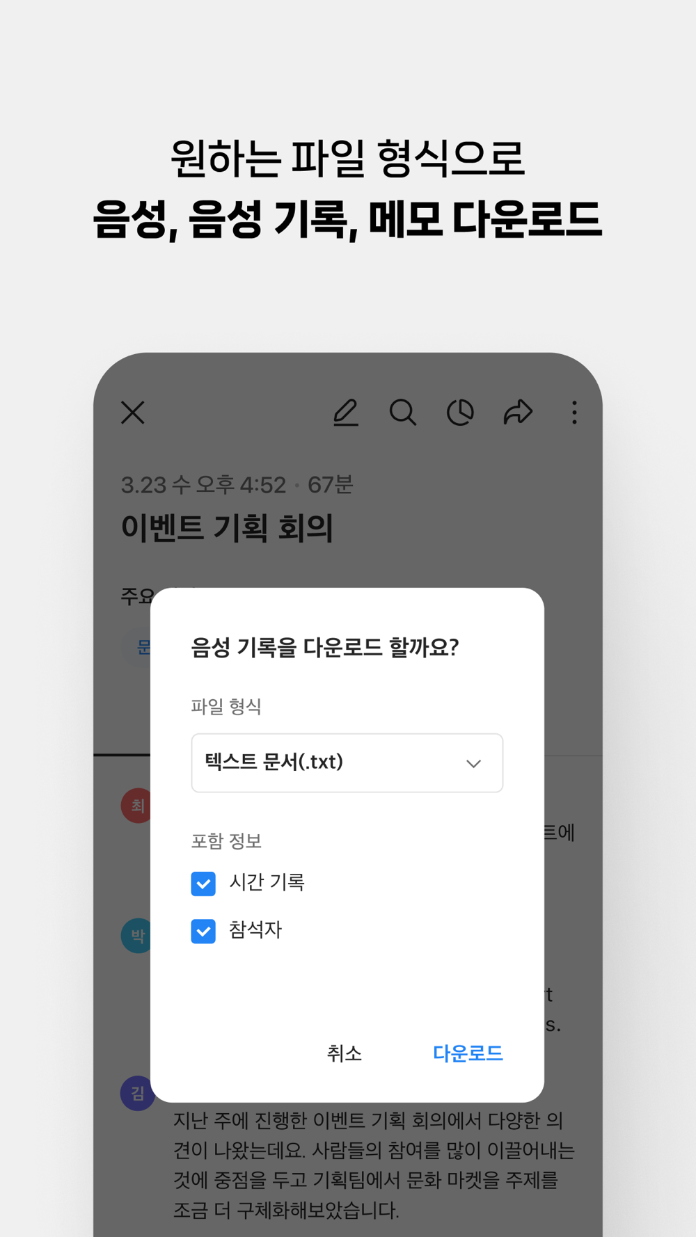 녹음한 음원, 음성기록, 메모를 파일로 다운로드할 수 있어요.