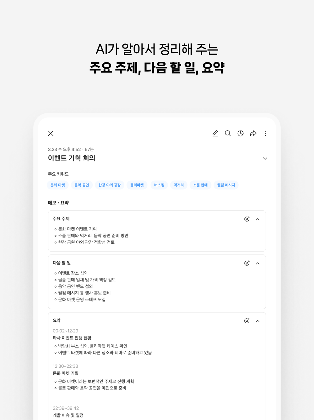 자동 추출된 요약/주요 주제/다음 할 일은 편집도 가능해요.