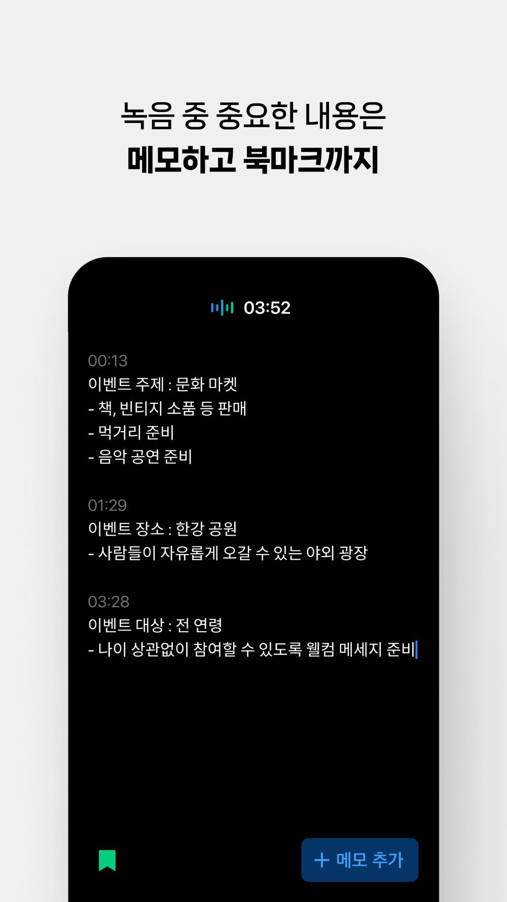 녹음 중 기억하고 싶은 내용이 있다면 바로 메모해 두세요.