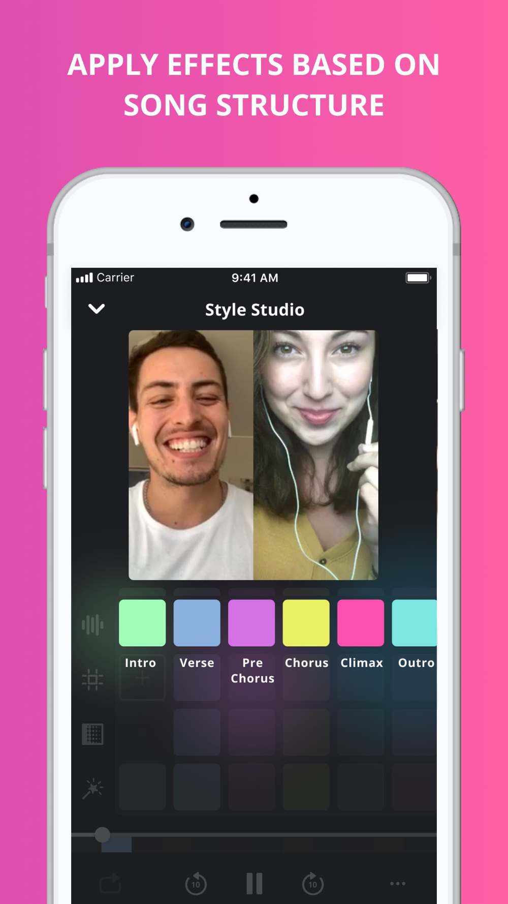 Add unique effects to each song segment: intro, verse, pre-chorus, chorus, bridge, and outro or apply one effect to multiple segments—you’re the producer!